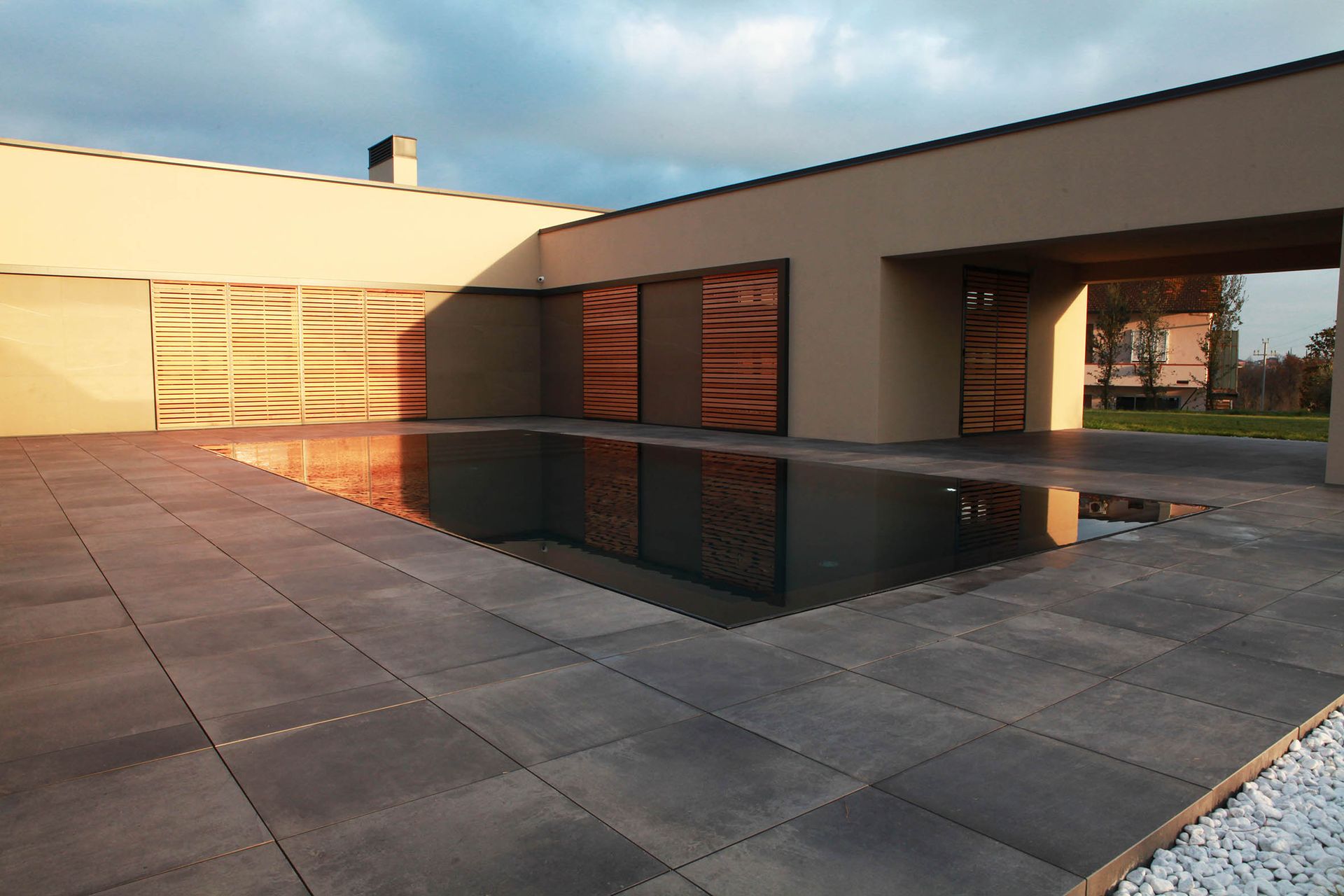 Tale omogeneità di rivestimento caratterizza in maniera decisiva il rapporto tra la vasca a sfioro, la corte e l’abitazione. L’utilizzo delle lastre in gres porcellanato dona al progetto i necessari accenti materici figurativo, dischiudendo aspetti dell’edificio sovrastati dalla severa volumetria.
