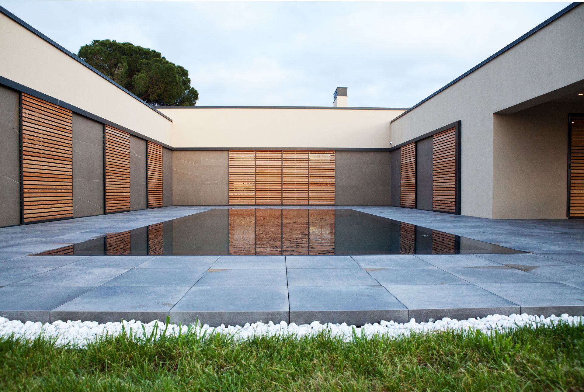 Le lastre di grandi dimensioni 90×180 cm applicate alle pareti, rispondono alla necessità di disegnare campiture materiche prive di suture sulle facciate; tali lastre segnano, nella corte, una fascia continua che include gli infissi prospicienti la piscina e fornisce uno sfondo adatto al ritmo dei frangisole scorrevoli.