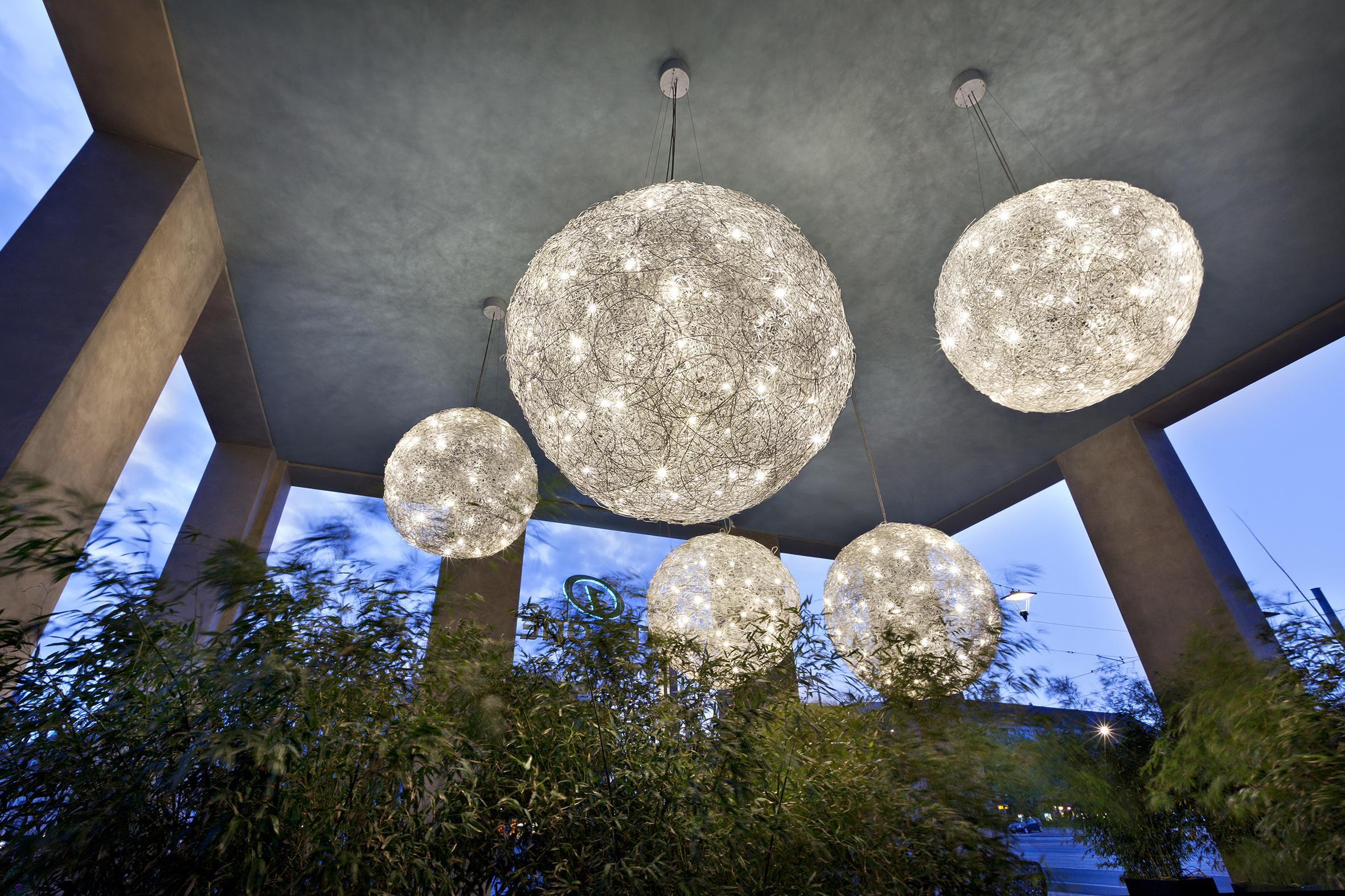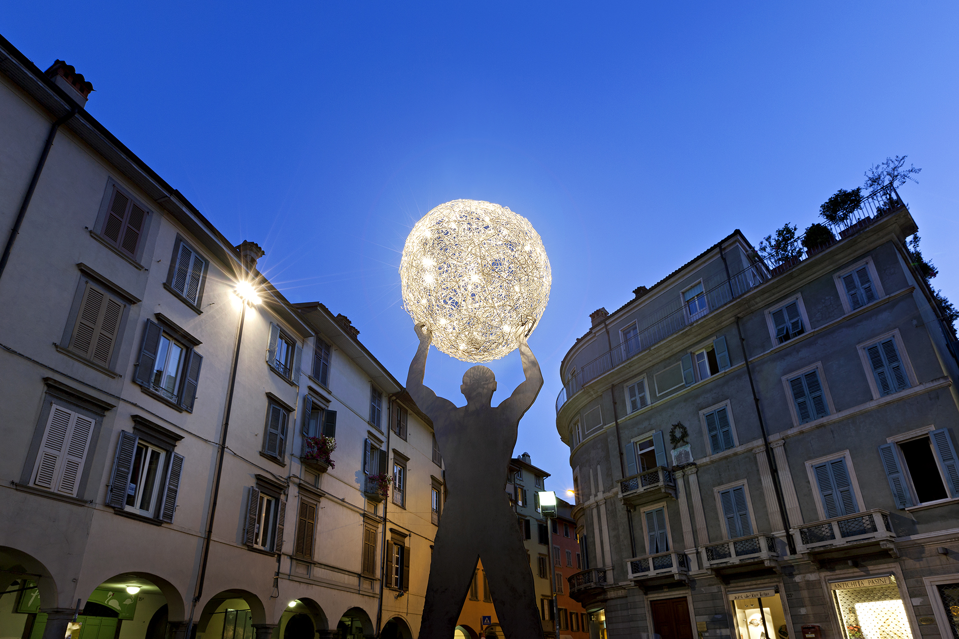 La lampada viene sorretta dalla scultura Uomo della Luce XXL realizzata in ferro grezzo. La statua ha le fattezze di un uomo le cui mani sorreggono la sfera luminosa: un’opera scenografica che raggiunge ben 310 cm di altezza tra la sagoma e la sfera con diametro 100 cm.