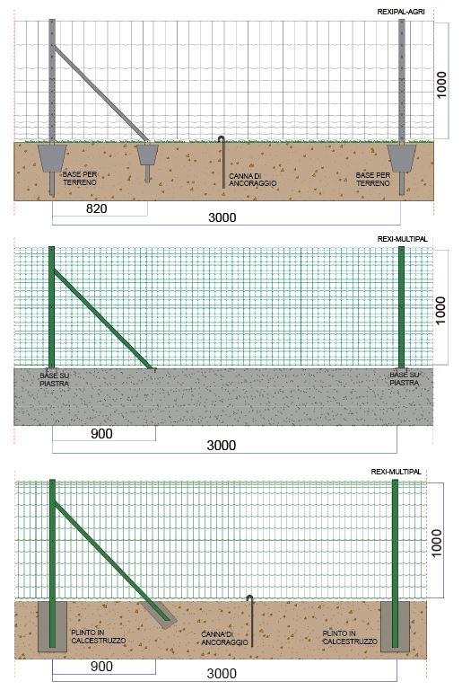 Per i pali del sistema Rexipal sono state previste tre tipologie di fissaggio al suolo in base alla natura del suolo stesso.