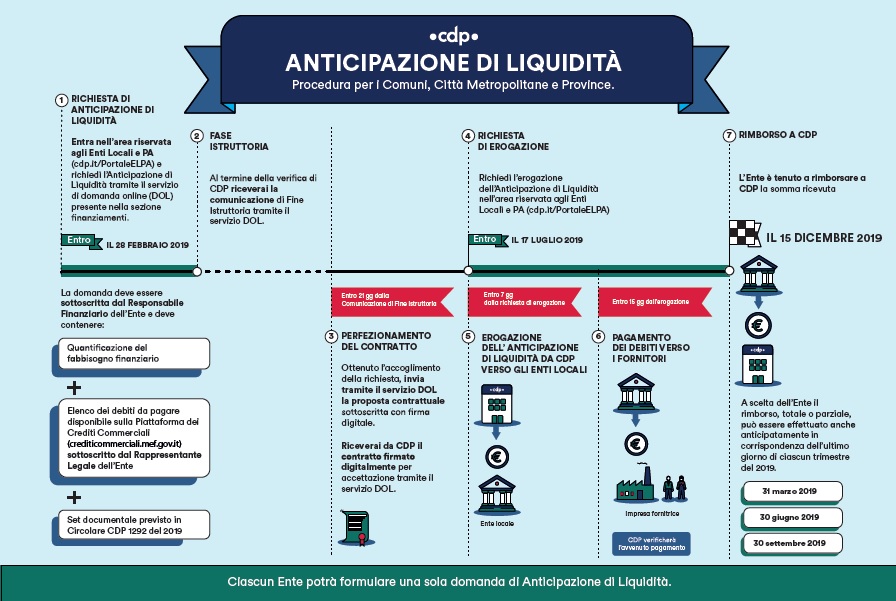 Gli enti interessati a usufruire della nuova misura potranno mandare richiesta di anticipazione di pagamento tramite il portale attivo dal 15 gennaio. La richiesta va mandata entro il 28 febbraio 2019. Dopo aver presentato la richiesta di erogazione, Cdp garantisce l’anticipazione di liquidità entro 7 giorni e l’ente potrà rimborsare l’importo entro il 15 dicembre 2019.
