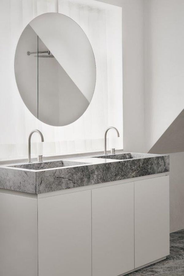 Nei bagni, le pareti in finitura di gesso e tadelakt, i pavimenti in marmo e i piani dei lavabi abbinati alla rubinetteria Cea Design in acciaio inox satinato, creano un ambiente contemporaneo sulle note cromatiche del bianco e del grigio.