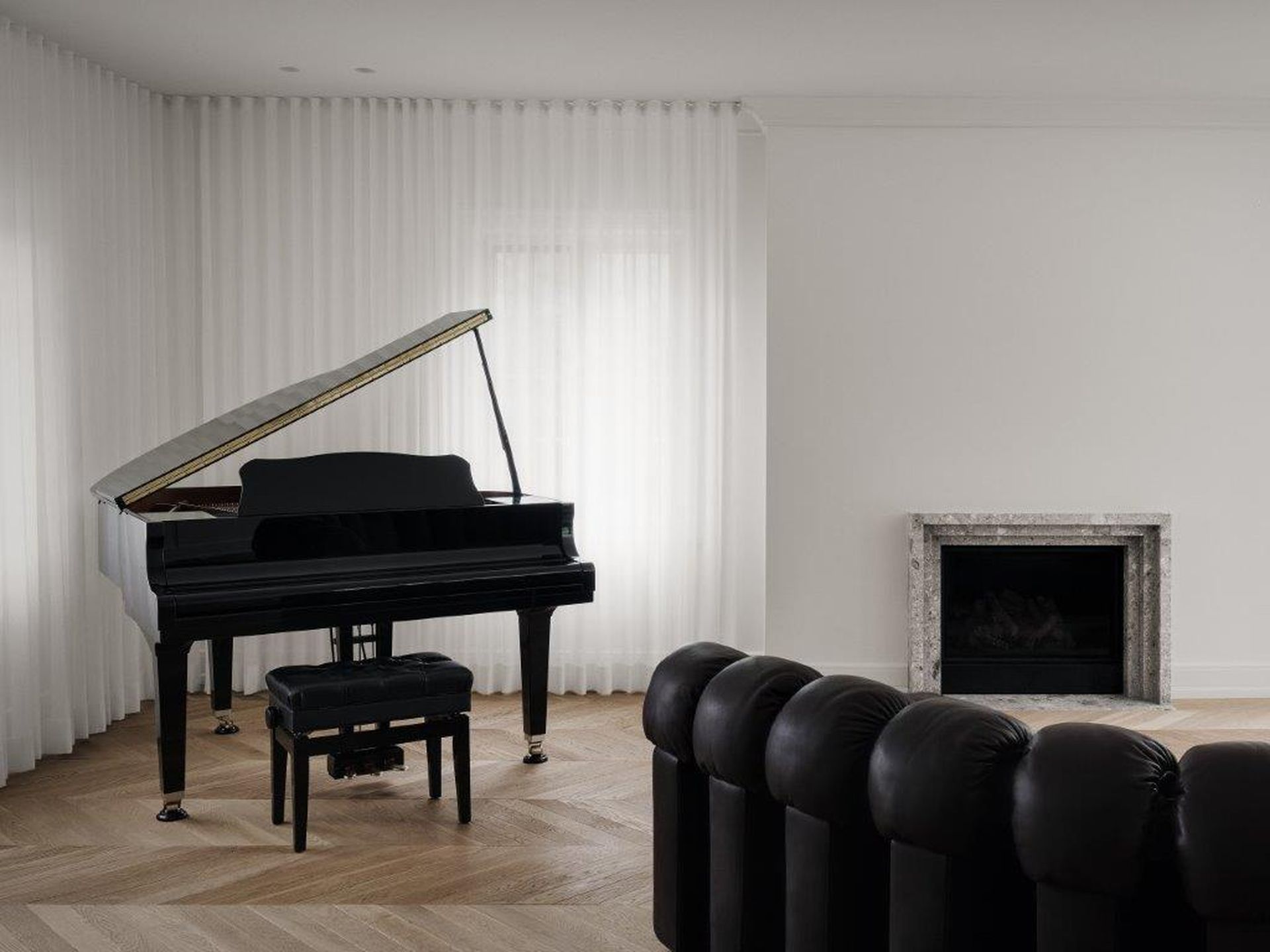 Strutturato su più piani per oltre 270 mq, l’abitazione vede al piano terra una zona giorno ampia e luminosa con spettacolari viste sul giardino. Il divano circolare in pelle, il pianoforte a coda e il caminetto armonizzano l’ambiente con eleganti tocchi di nero e grigio.