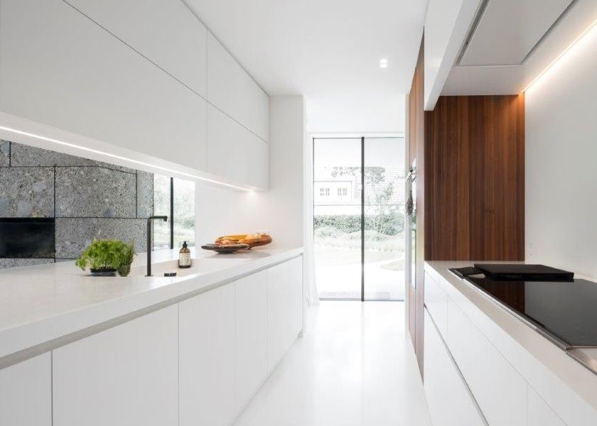 La residenza privata dell’architetto De Beir, interamente ripensata rispetto alla costruzione precedente, sorge a Knokke, in Belgio. Dall’entrata principale si accede dapprima al giardino, quindi, attraverso un sentiero sinuoso, alla cucina direttamente collegata a una grande terrazza immersa nel verde e circondata dal mare. Nonostante il tetto di paglia e un aspetto apparentemente tradizionale, la casa stupisce per la modernità degli interni e per l’ampiezza degli spazi, data dalla scelta di grandi vetrate e da un uso sapiente dei materiali lavorati artigianalmente in Italia, Germania e Repubblica Ceca.