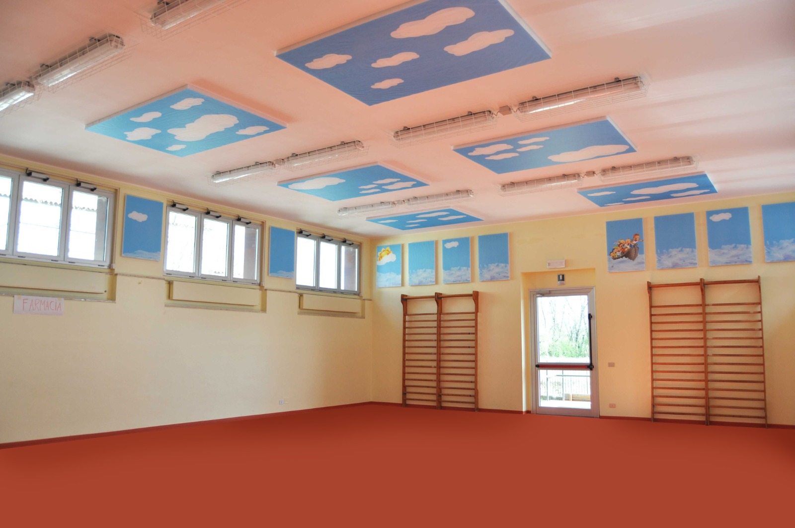 Lo svolgimento dell’attività sportiva, soprattutto dei più piccoli, non si migliora solo grazie alla tecnologia acustica dei pannelli isolspace, ma anche grazie alla loro personalizzazione, come dimostra l’intervento effettuato presso la palestra della scuola Santa Maria Consolatrice di Pavia. In questo caso con isolspace style si è potuto ricreare sul soffitto della palestra l’atmosfera di un cielo terso costellato di nuvole bianche e sulle pareti il movimento delle onde del mare che si stagliano all’orizzonte, rendendo più piacevole l’ambiente.
