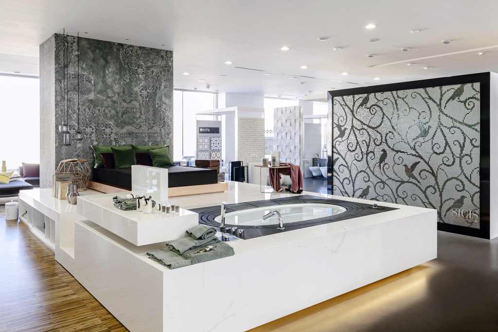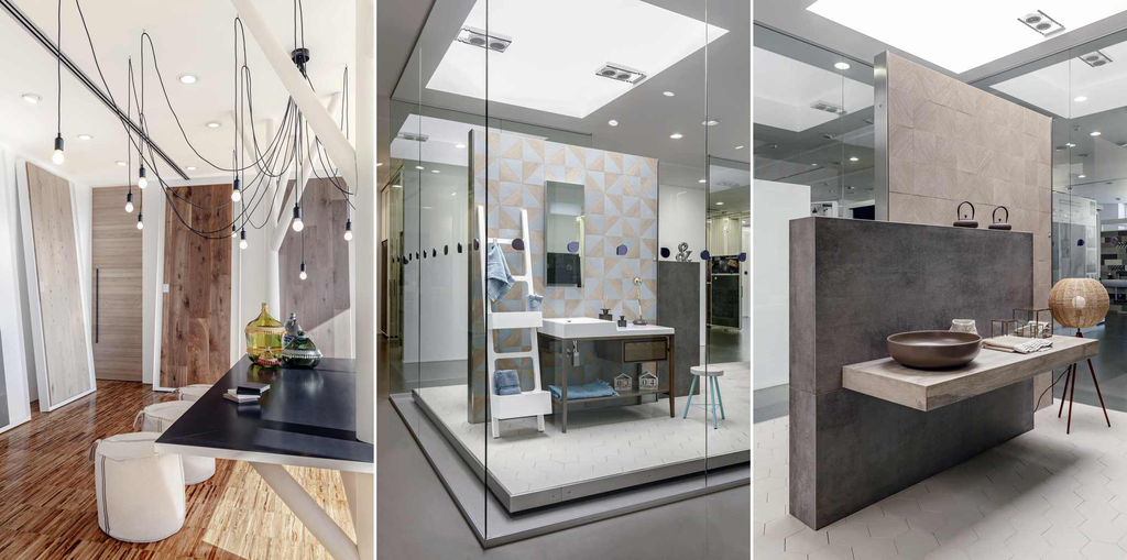 Lo showroom è stato progettato con l’obiettivo di far vivere al cliente una reale esperienza polisensoriale, creata dal concept espositivo e facilitata dalla musica di sottofondo, da profumi d’ambiente, che rimane nel ricordo del cliente (foto Centro Edile Quartarella)