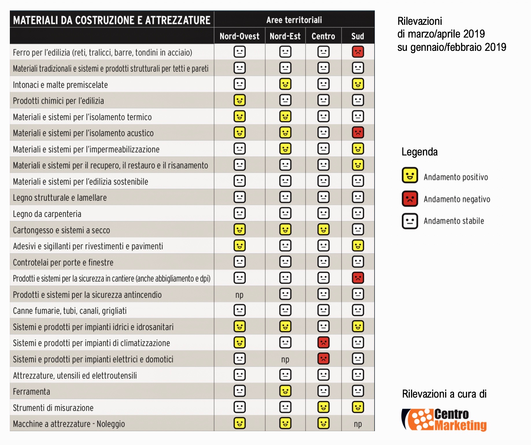 Crescono le vendite di intonaci e malte premiscelate, soprattutto nel nord est, dove il 62,5% di rivenditori intervistati da Centro Marketing riferisce una ripresa della domanda (rilevata anche dal 57,1% degli intervistati del Sud) almeno nel bimestre marzo/aprile 2019 in riferimento a quello precedente (gennaio/febbraio). Sempre in due (60% a nord ovest e 57,1% a nord est) su quattro macroaree in cui è diviso il panel di riferimento, crescono anche le richieste di materiali e sistemi per l’isolamento termico e quelli per l’isolamento acustico (53% a Nord-ovest e 42,9% nord-est), mentre rimangono stazionarie le vendite dei prodotti per il restauro e il risanamento che registrano una vera impennata al sud, come dichiarato dal 100% dei rivenditori intervistati.