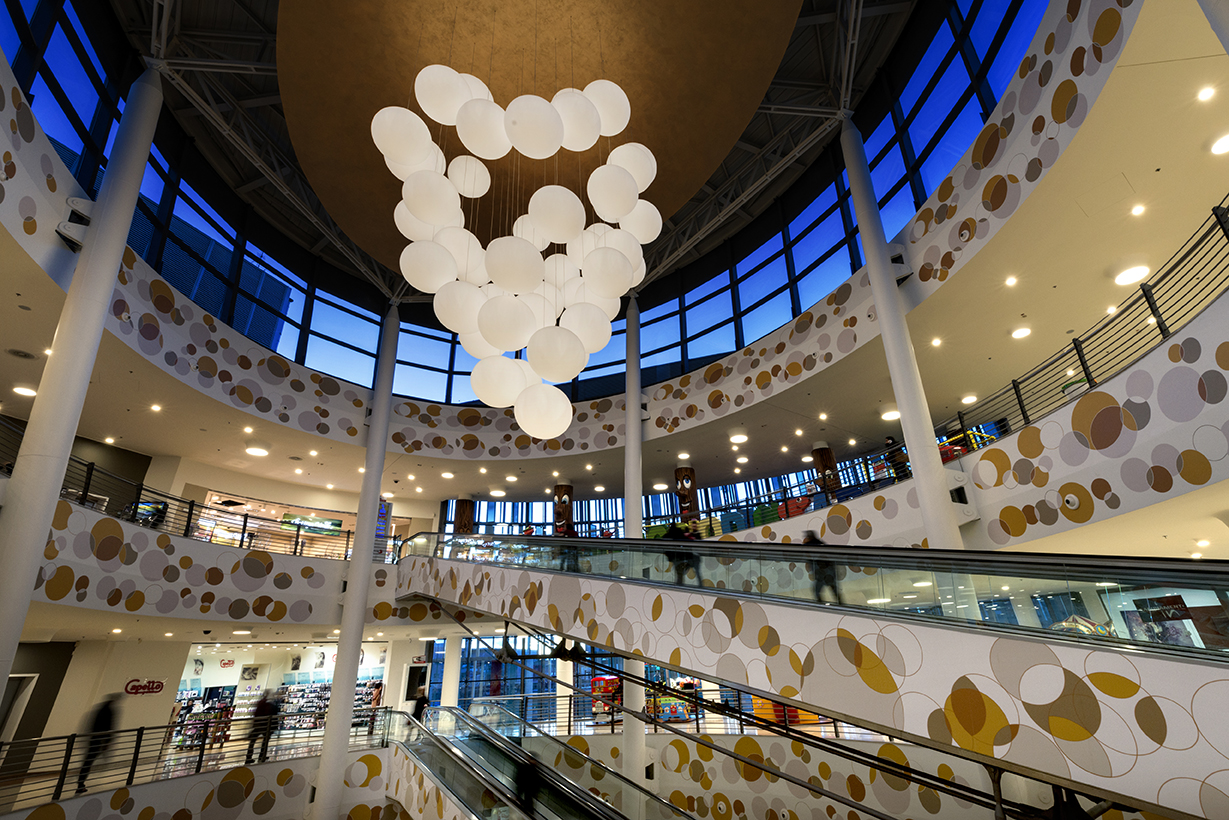 I grandi aggregatori sono le tre piazze che compongono il centro, più o meno aperte verso il cielo e la luce naturale e differenziate secondo temi naturalistici. Così, pilastri che diventano giganti steli di calle fino alla copertura disegnano un paesaggio fiabesco e primaverile nella piazza A; un enorme grappolo d’uva (di cui ogni acino è una fonte di luce opalina) cala nel centro dell’invaso della piazza B, ed è la controparte autunnale. La piazza C, rinnovata nell’organizzazione dei flussi e nella pavimentazione dal cui disegno emergono le sedute, è votata all’incontro e alla sosta.