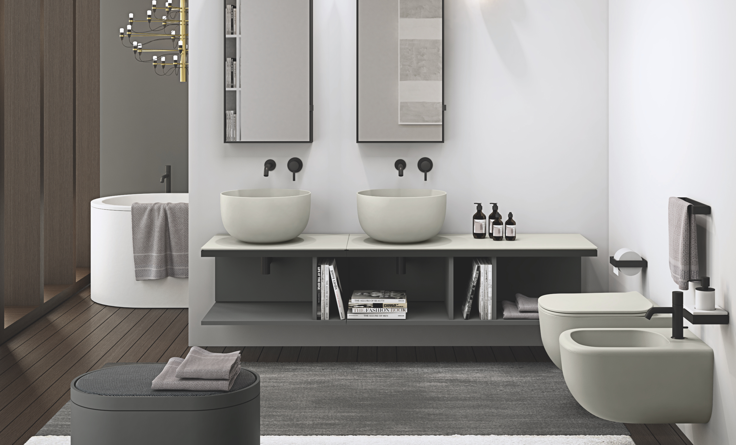 In questa cornice si inseriscono le linee I Catini di Andrea Parisio e Giuseppe Pezzano, Era di Luca Cimarra, Enjoy di Karim Rashid e Smile, che creano suggestioni dal mood cosmopolita e donano carattere e personalità alla sala da bagno.