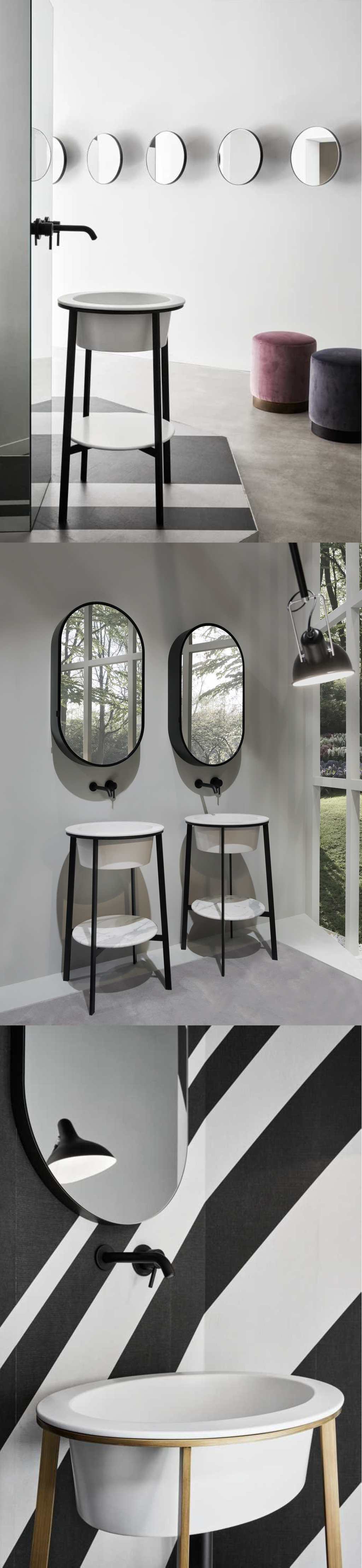 Proposti con o senza predisposizione per la rubinetteria, questi lavabi in ceramica si integrano armoniosamente con eleganti strutture in acciaio nelle finiture nero o bronzo spazzolato, con comodi piani d’appoggio in ceramica o marmo o funzionali cassetti in legno.