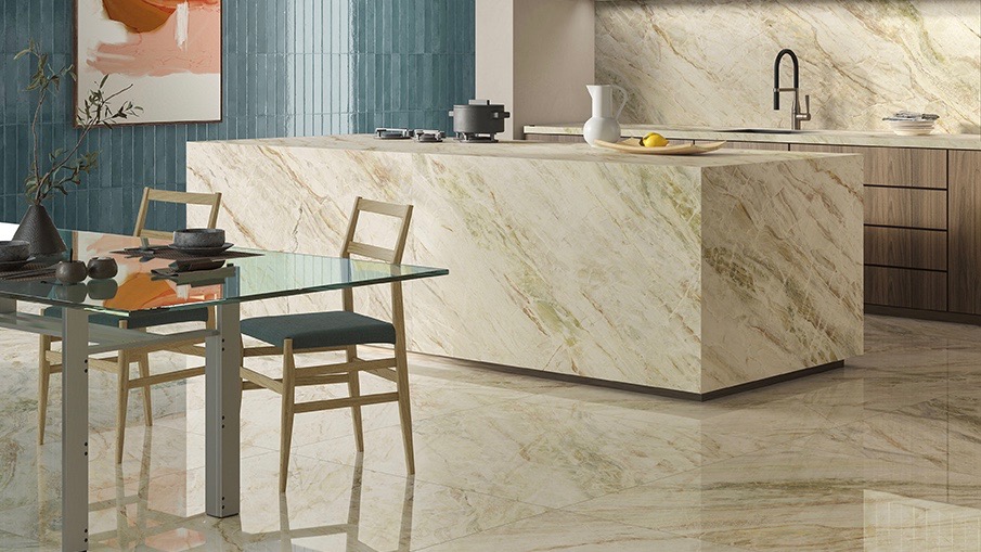 L’ambiente cucina diventa uno spazio eclettico grazie alla collezione di superfici di Ceramica del Conca che richiama i canoni estetici del marmo.