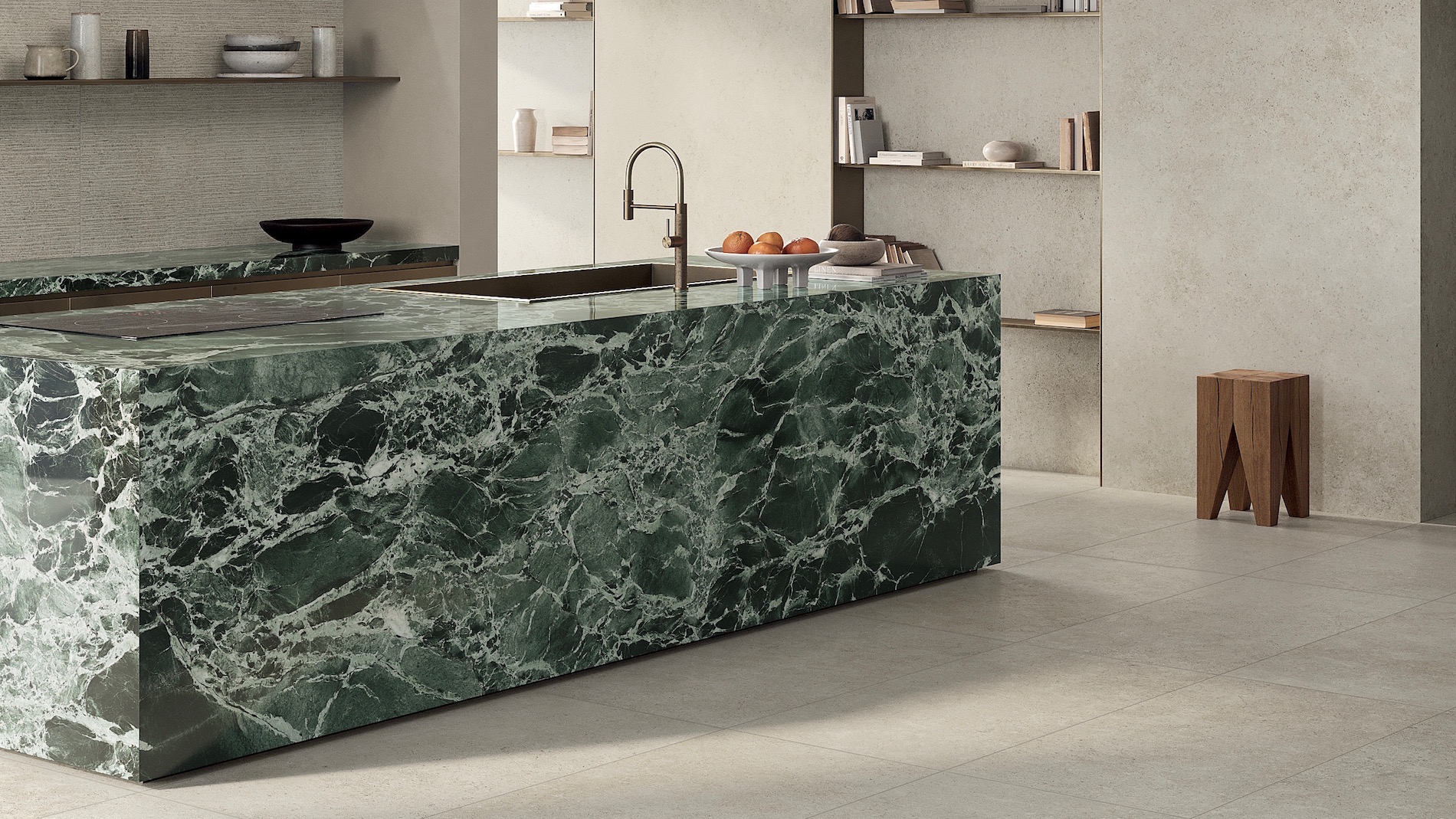 La collezione Background trova, invece, la sua ispirazione in una pietra Limestone di origine calcarea quasi monocromatica nella texture che trattiene gli elementi primari che la caratterizzano ma li evolve per dare origine a un gres porcellanato dall’estetica minimale, con una finitura estremamente opaca e piacevole al tatto, che riveste ambienti di rara bellezza.