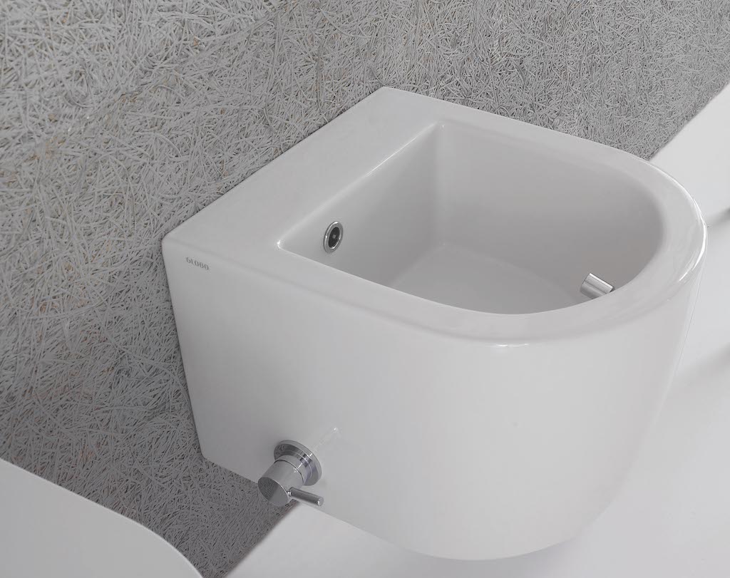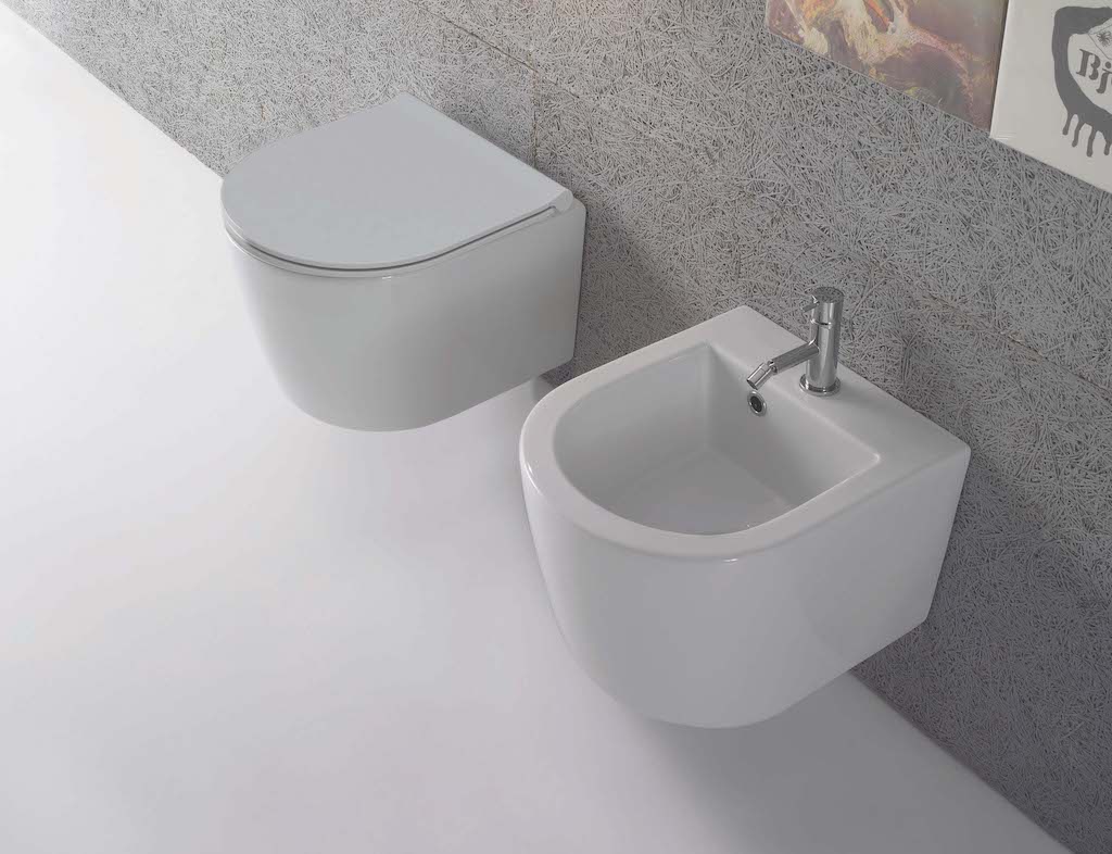 Il wc è senza brida e con sedile a chiusura rallentata, mentre il bidet è disponibile anche con l’erogazione dal basso e miscelatore laterale.