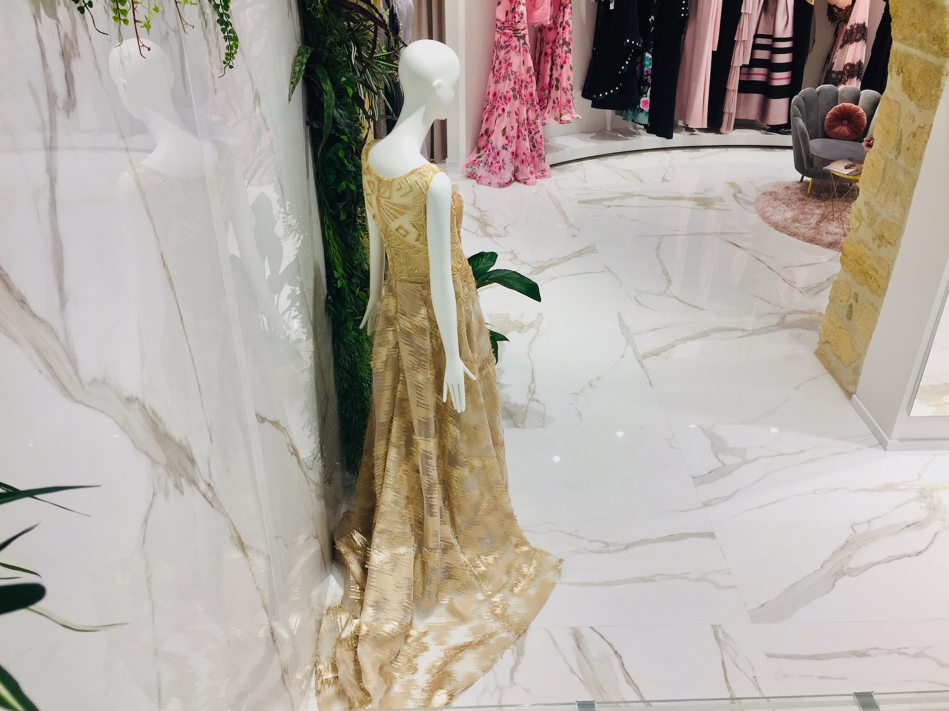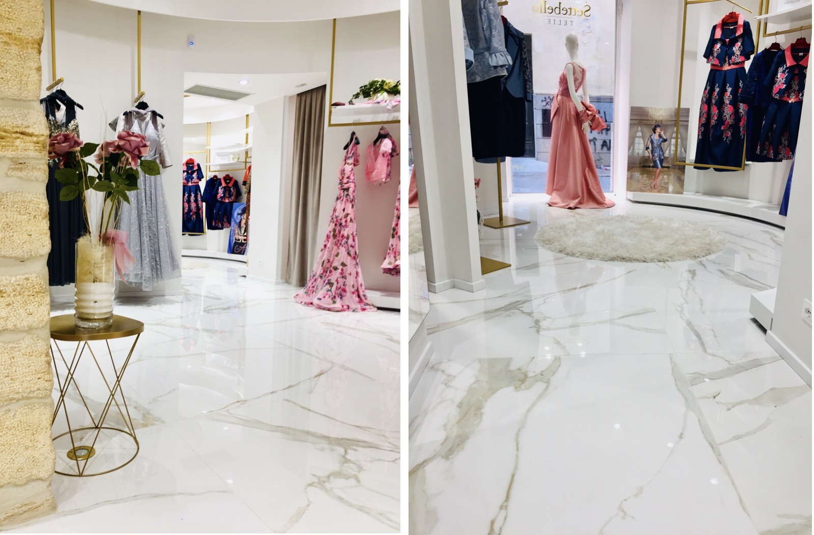Il marmo ceramico lappato di Elements Lux accompagna la finezza e la sinuosità degli abiti eleganti che contornano le pareti del negozio, riproducendo il grafismo tipico del marmo e offrendo una superficie finale dal gusto classico ed estremamente ricercata.