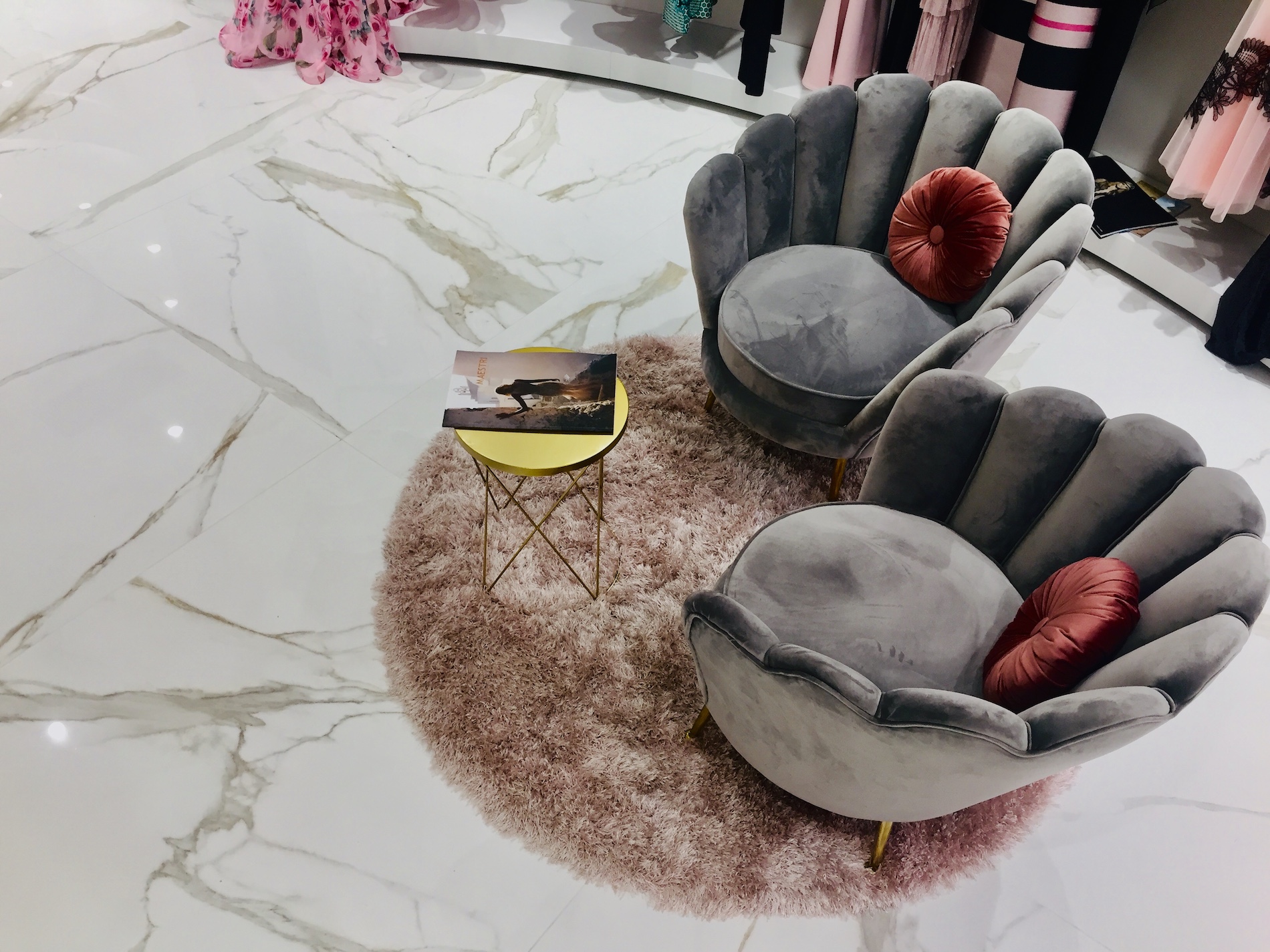 Il formato 120×240 cm dona valore alla parete principale dello studio, mentre il 120×120 cm si estende sul pavimento fino al centro del negozio dove due poltrone accoglienti ospiteranno i clienti dell’atelier.