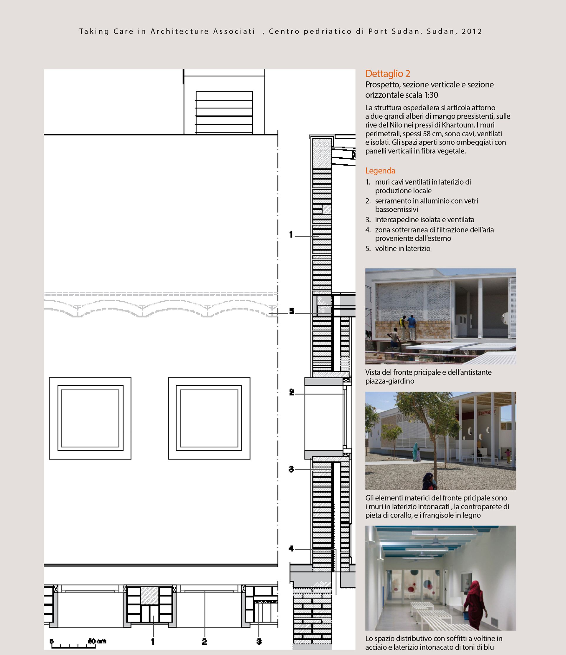 Mentre nel centro pediatrico di Bangui la muratura cava è spessa 35 cm e i due strati in laterizio delimitano l’intercapedine di ventilazione, nelle murature di Port Sudan e del centro “Salam” vengono adottate soluzioni ancora più performanti, con una maggiore massa termica per le pareti e l’aggiunta di uno strato isolante a fianco alla camera di ventilazione creata tra i muri di laterizio.