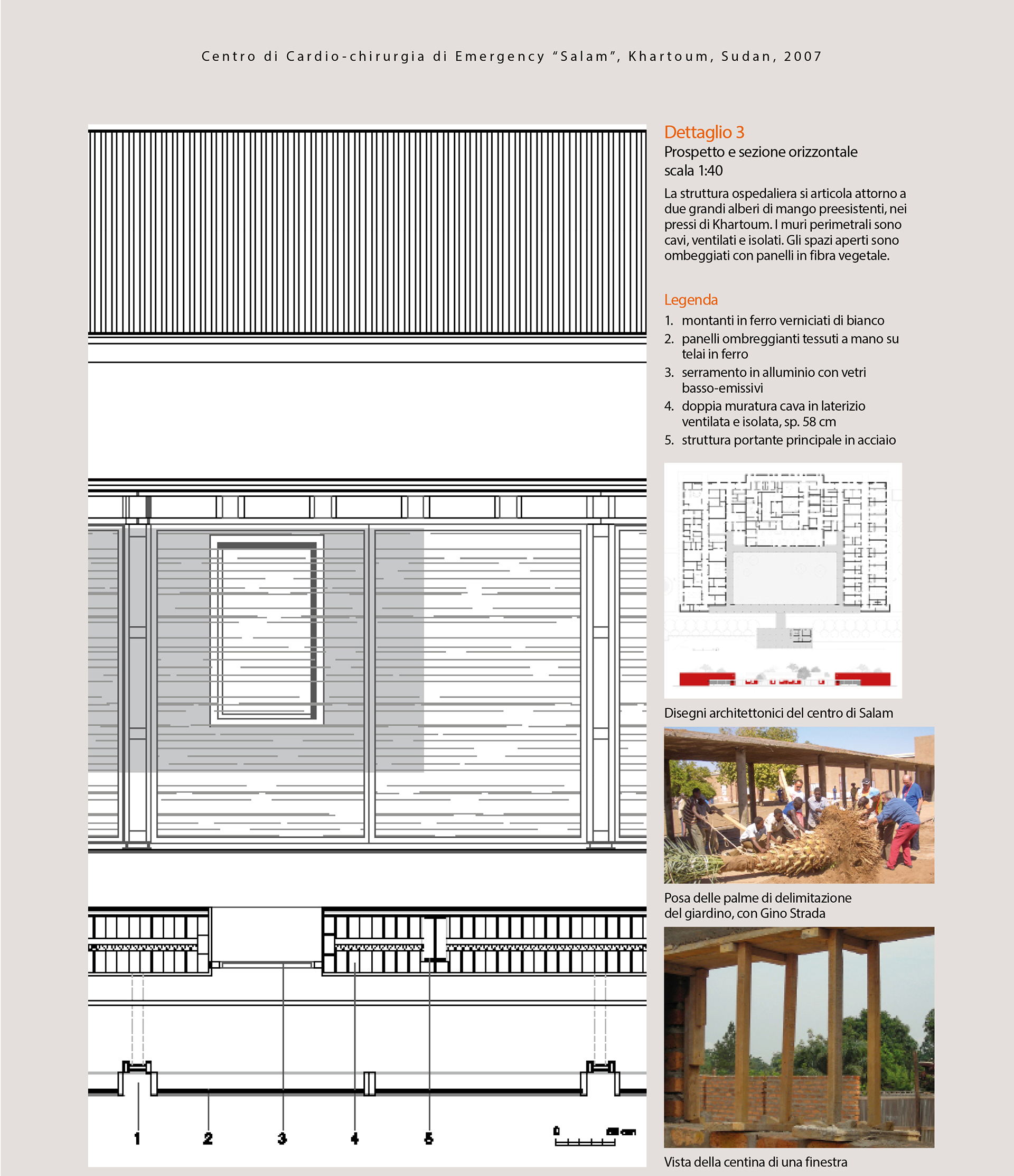 Infine il centro cardio-chirurgico “Salam” si caratterizza per l’accostamento di strutture in acciaio prefabbricate con le murature in laterizio posate in opera. High tech nella concezione e low-tech nella costruzione sono il mix sapiente di strategie messe a punto da Tam per queste architetture.