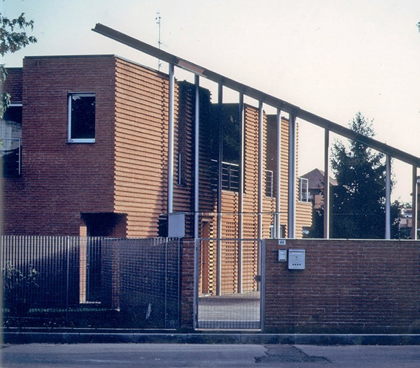 Il contrappunto cromatico tra l’ampia copertura del portico color rame e le superfici in laterizio della casa di Abbiategrasso consente di rintracciare già nel 1996 questa duplice regola compositiva, che dà valore tanto al sole quanto alla storia, alle necessità domestiche e alla coerenza con il sedime urbano.