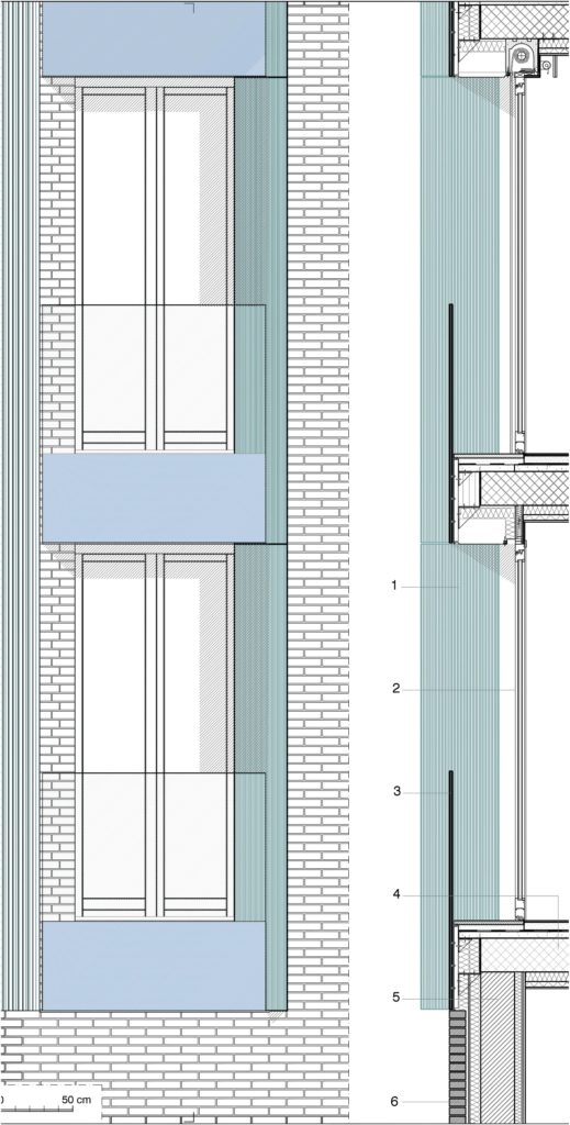 5. Parete perimentrale in blocchi di laterizio, sp. 25 cm con cappotto isolante esterno, sp. 9 cm e strato di isolamento acustico interno, sp. 5 cm.