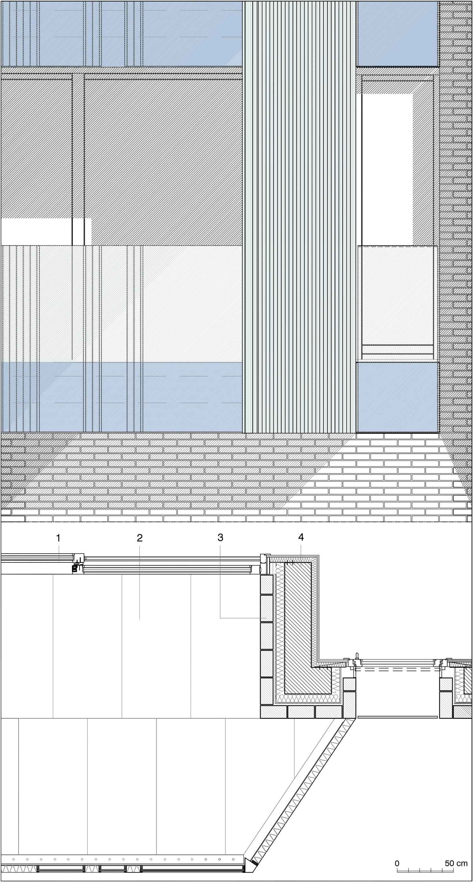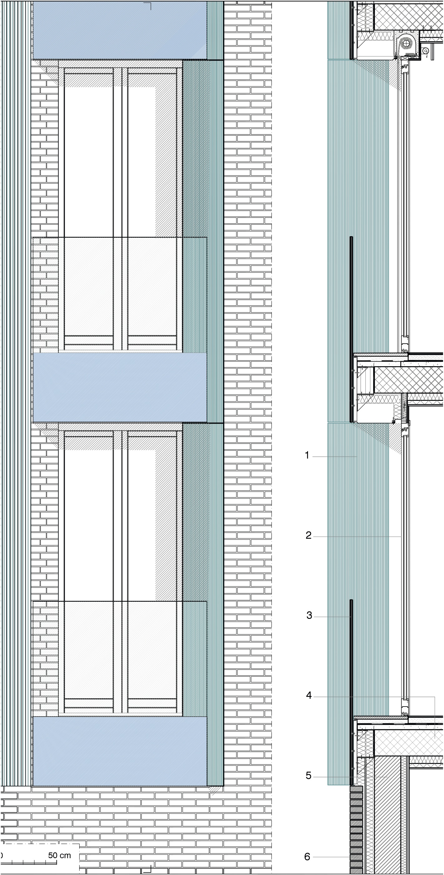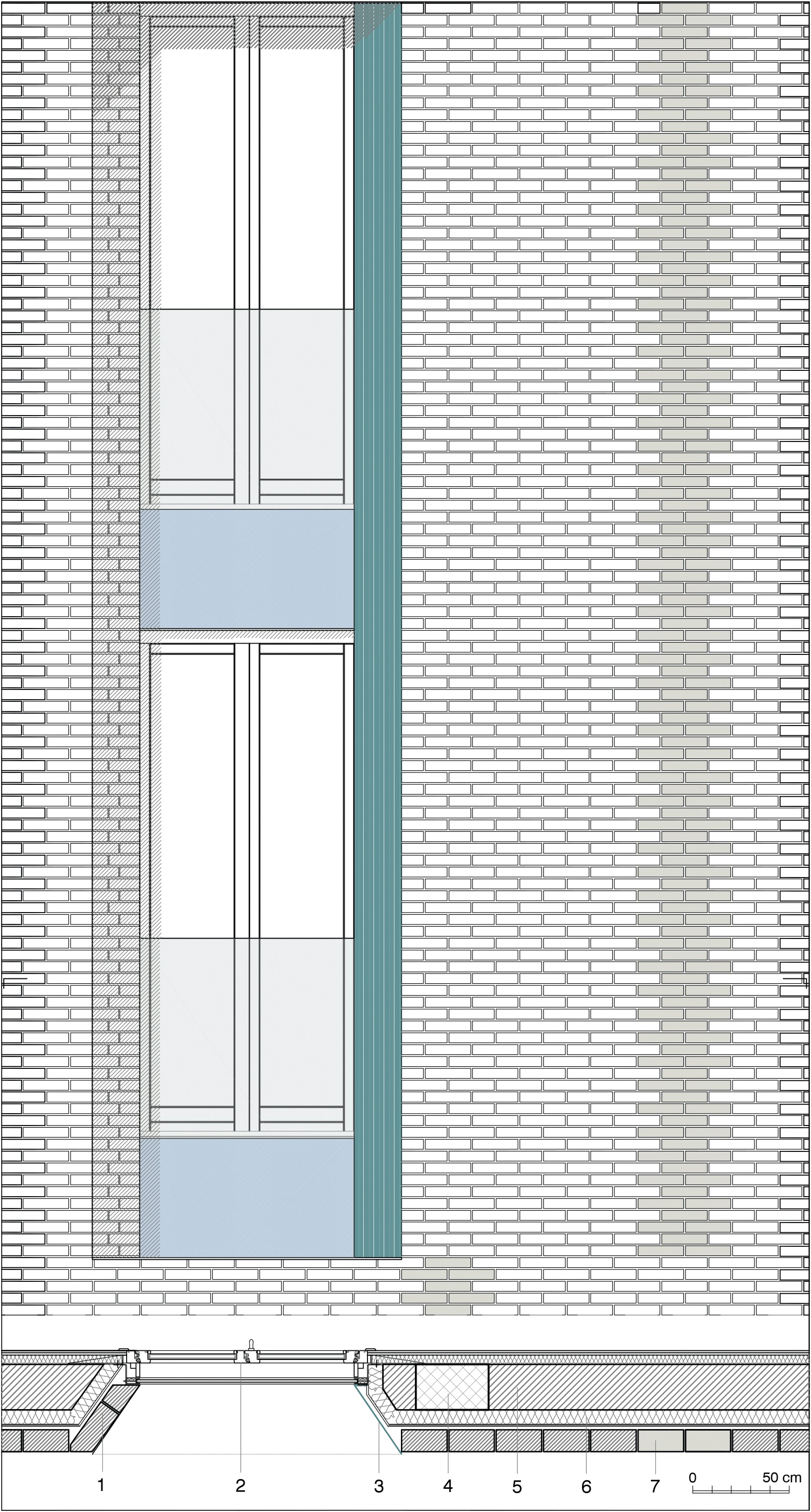 Tessitura muraria in laterizio con finestre isolate, scala 1:35.
