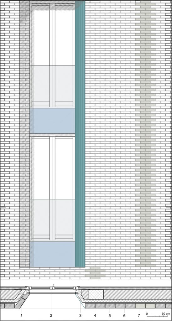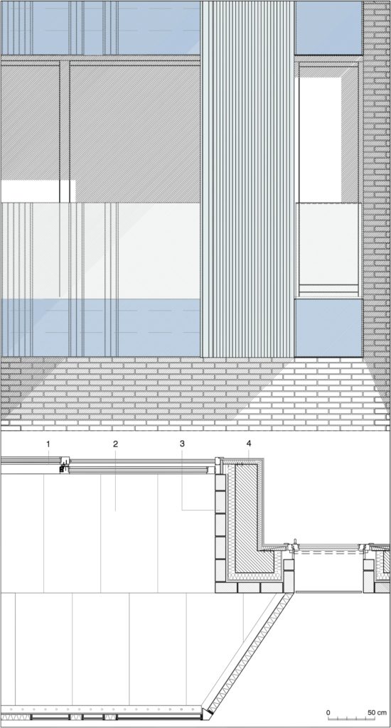 Lo sgiuncio in alluminio verniciato di l’interfaccia tra superfici vetrate e superfici in laterizio, incorpora sapientemente scelte compositive e tecniche. Una variente linguistica sull’ibridazione di superfici in laterizio e metalli colorati appariva già nel complesso residenziate di Trilogia Navile a Bologna.