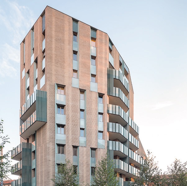 Balconi con i parapetti in vetro sabbiato e profonde logge con estremità a sguincio trattate con elementi metallici colorati creano un forte contrasto cromatico con le campiture in laterizio retrostanti.