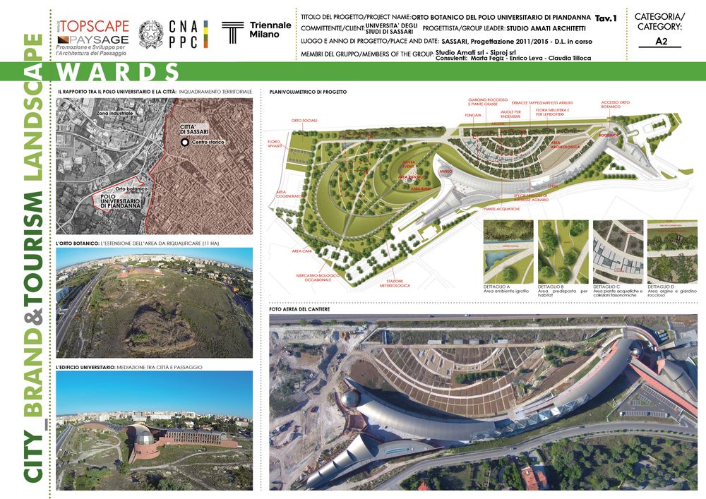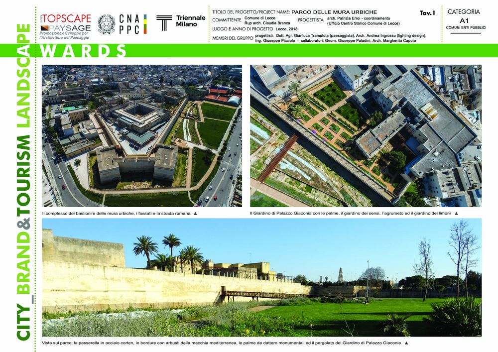 Il primo premio nella categoria dedicata alla riqualificazione paesaggistica degli spazi urbani, è stato assegnato al Parco delle Mura Urbiche di Lecce presentato, per il Comune di Lecce, da Patrizia Erroi; nella categoria City Landscape, focalizzata sulla riqualificazione paesaggistica dei territori di frangia, ad essere premiato è stato il progetto dell’ Orto Botanico del Polo Universitario di Piandanna a Sassari, a firma dello Studio Amati Architetti.