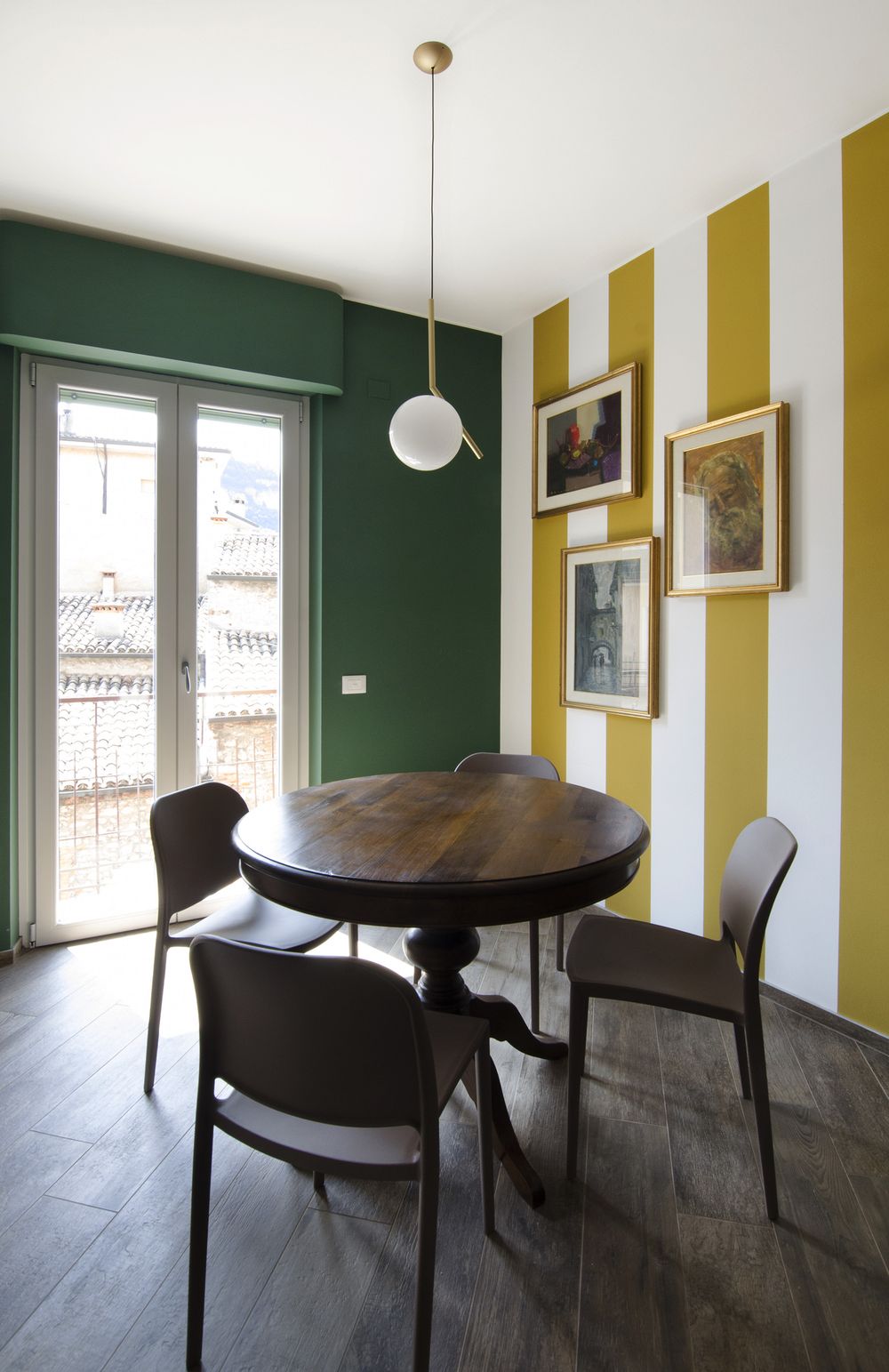 L’appartamento D’Annunzio accoglie con tonalità eccentriche ed eleganti, che giocano sul contrasto tra le note del legno e i colori brillanti delle pareti, tra l’arredo d’antiquariato e quello di design.