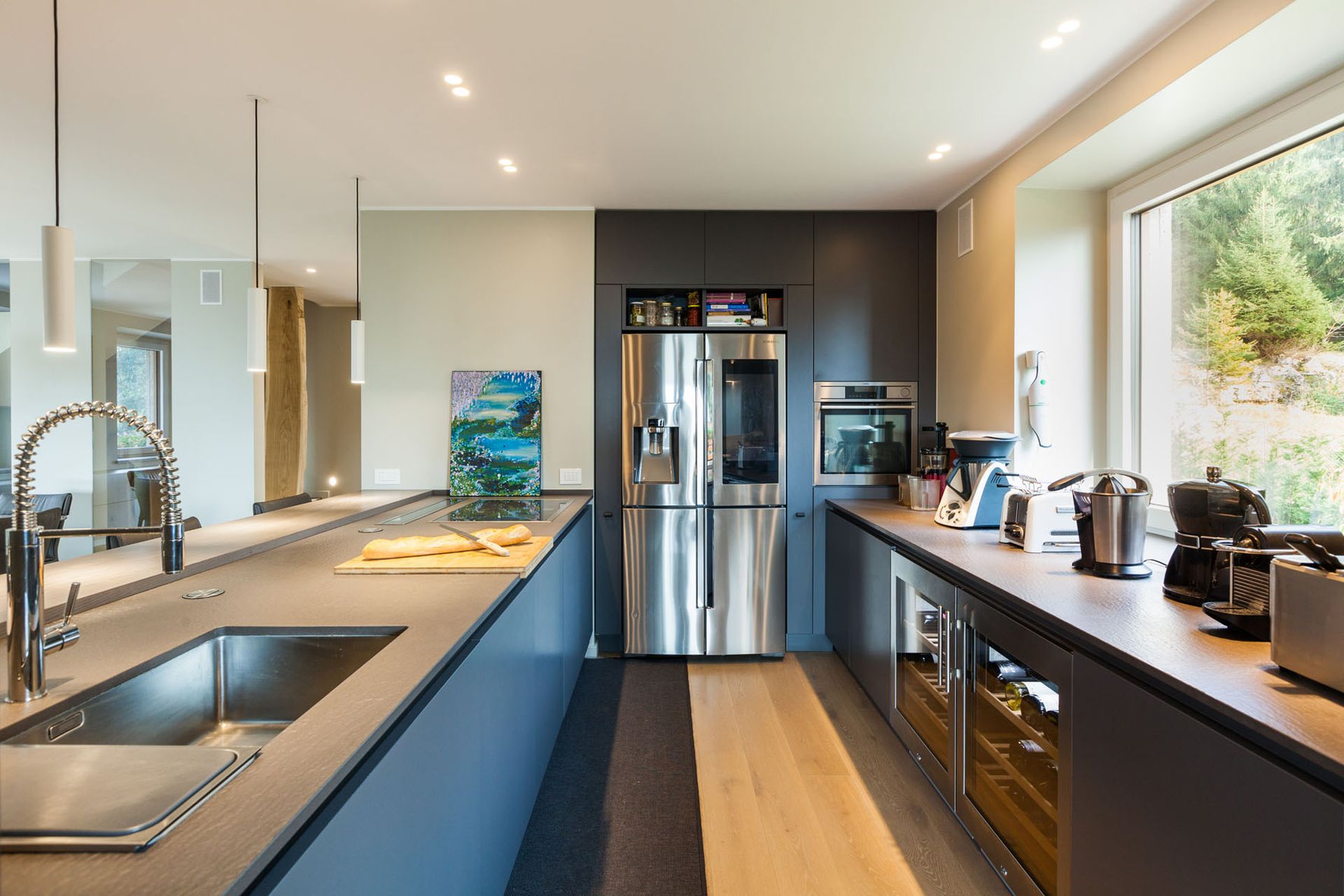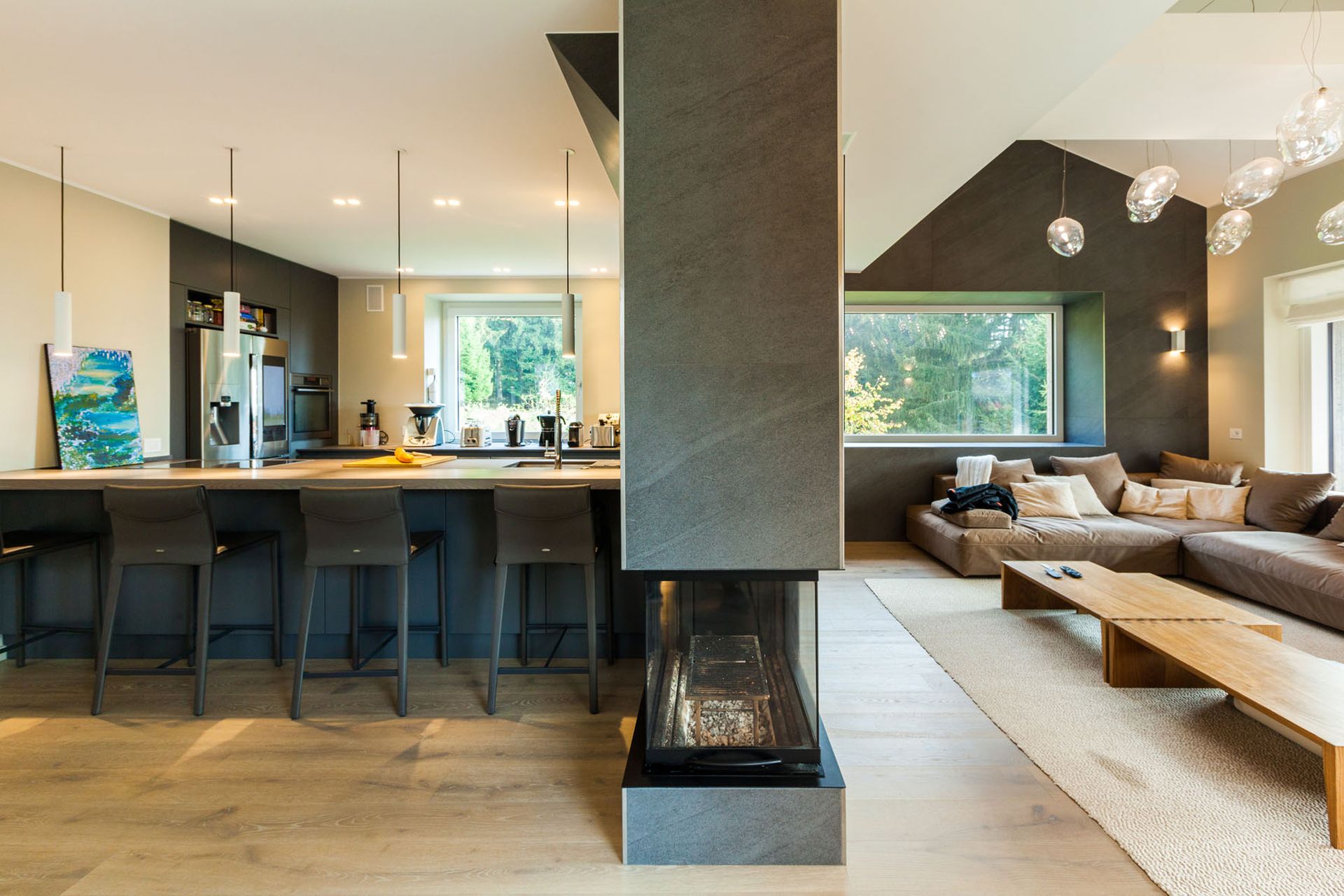 E nell’indoor la suggestiva combinazione di architettura e natura si realizza grazie ad ambienti in cui convivono funzionalità e design, in un gioco virtuoso con ampie superfici vetrate e finiture ed arredi ricercati, che rendono l’abitazione un tutt’uno con il paesaggio.