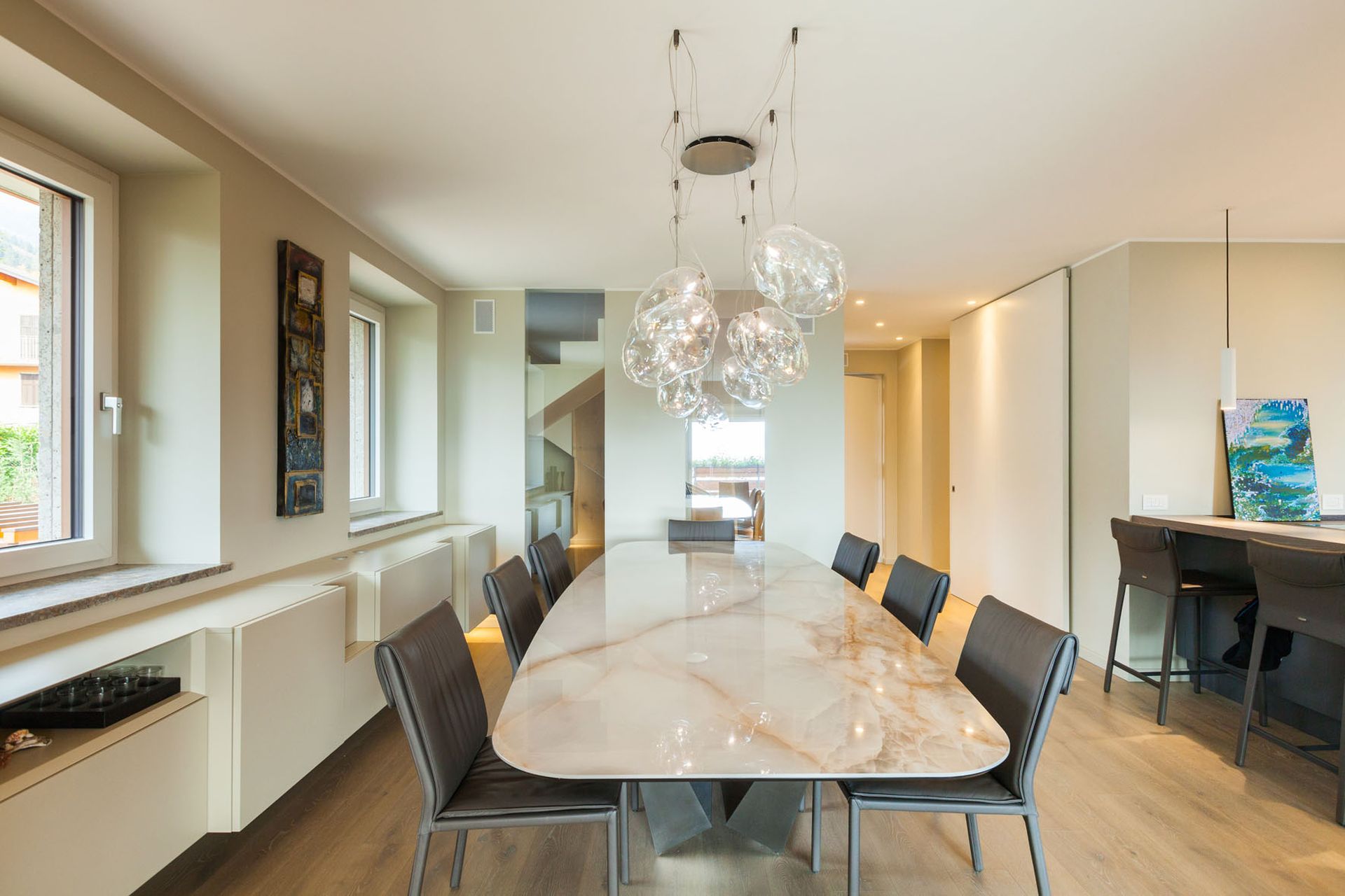 Come il suggestivo effetto a cascata che definisce la zona living, ottenuto grazie all’abile gioco di livelli realizzato con faretti pendenti Oty Light nella cucina e un lampadario a sospensione con paralumi in cristallo Cattelan, posizionato sopra l’elegante e raffinata tavola firmata anch’essa Cattelan. Una combinazione audace che si riflette nei tessuti e nei materiali presenti nella stanza, ravvivandola con un movimento di diffusione verticale della luce.