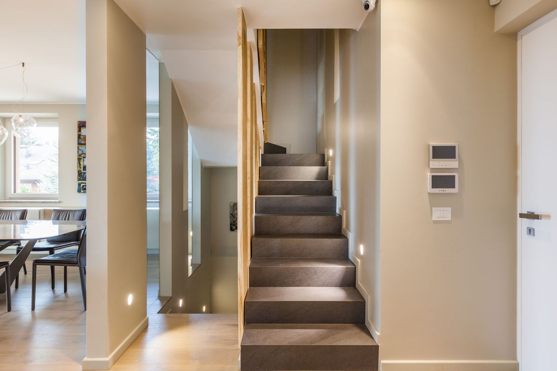 Un dettaglio costruttivo ulteriormente valorizzato da inaspettati scorci visivi che, dagli ambienti attraversati, aprono nel vano scale mediante pareti in vetro, realizzate in Stopsol super silver a tutt’altezza: una combinazione di materiali che alleggerisce gli spazi, conferendo al tempo stesso un senso di maggiore ampiezza e luminosità, grazie anche all’effetto specchio che si genera a luci spente.