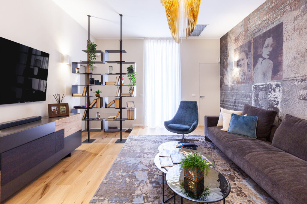 Clm Design & Contract ha pensato di impreziosire l’appartamento progettando una suggestiva parete verde verticale: l’elemento green conquista al primo sguardo e, all’occorrenza, consente la separazione tra la cucina e il salotto grazie alla chiusura delle porte scorrevoli poste ai lati della parete verde.