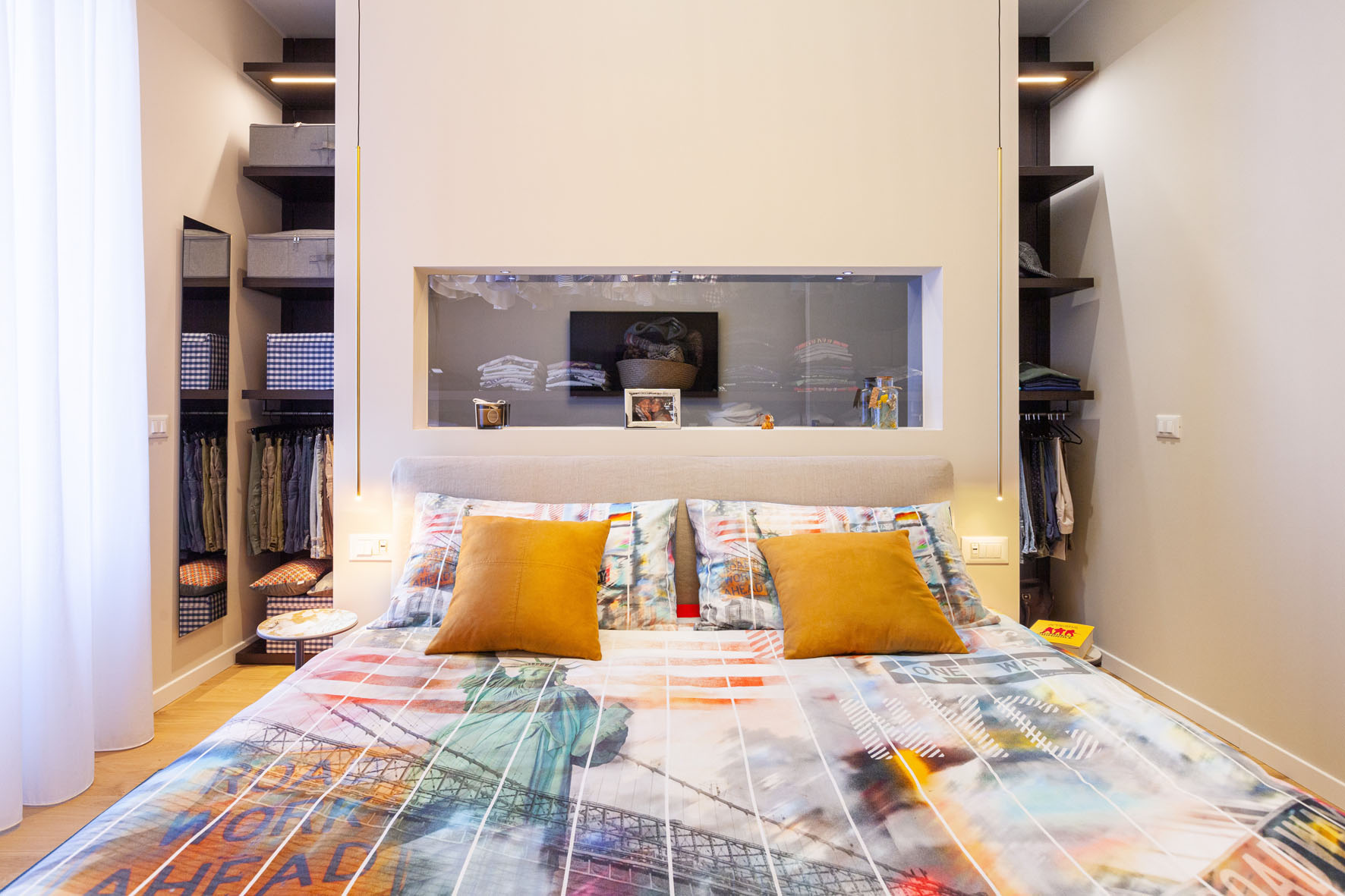 Per il living room è stata utilizzata una carta da parati creativa che richiama le tonalità utilizzare per l’arredamento dell’ambiente: un elemento che ha conferito alla stanza un appeal deciso. Il team di designer di Clm ha seguito i clienti nella selezione delle moodboard per i tessuti: i cuscini e i tappeti hanno conferito un tocco caldo e accogliente alla casa.