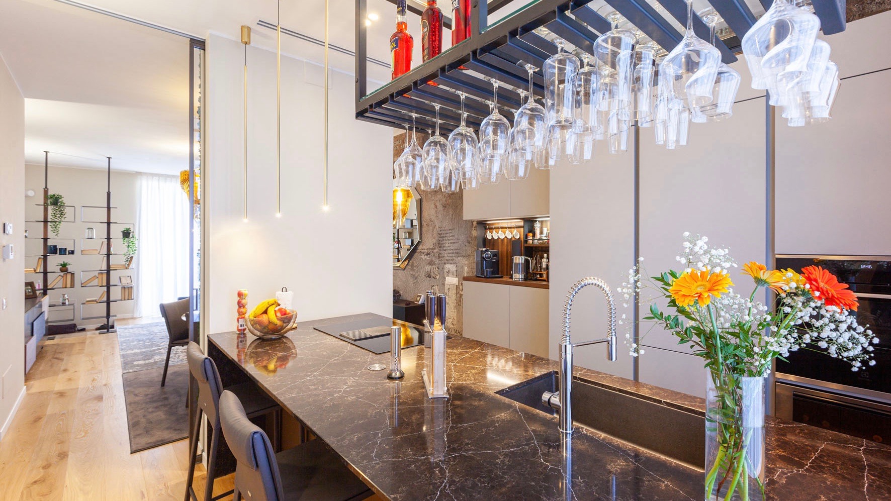 Clm Design & Contract ha pensato di impreziosire l’appartamento progettando una suggestiva parete verde verticale: l’elemento green conquista al primo sguardo e, all’occorrenza, consente la separazione tra la cucina e il salotto grazie alla chiusura delle porte scorrevoli poste ai lati della parete verde.
