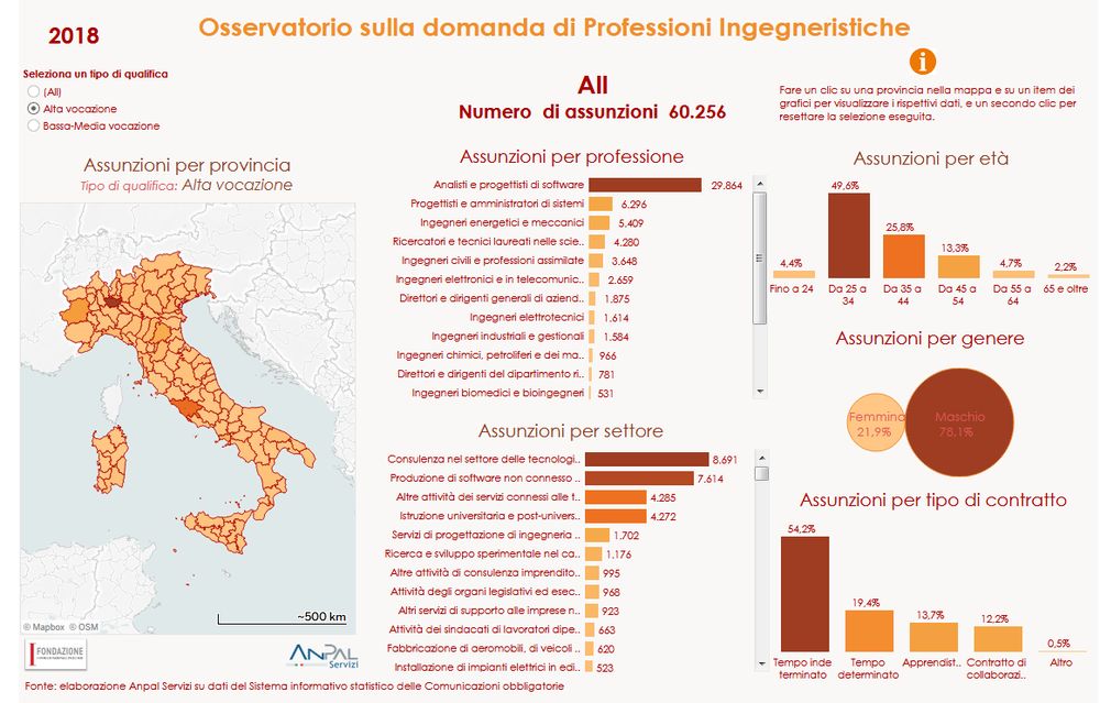 Sono oltre 60mila gli assunti con profili attinenti alle professioni ingegneristiche che non riguardano esclusivamente individui in possesso di una laurea in ingegneria, ma si riferiscono ai tipi di mansioni svolte in larga parte dagli ingegneri.