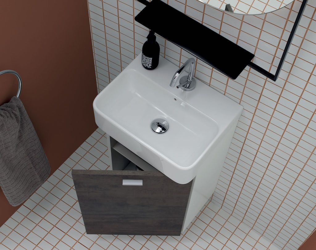 L’altro è un lavabo squadrato da appoggio che, con un ingombro di 45×25 centimetri, permette di arredare gli spazi più difficili, grazie anche al posizionamento laterale del foro per il miscelatore. Pure in questo caso un mobile contenitore sospeso permette di riporre oggetti e biancheria.