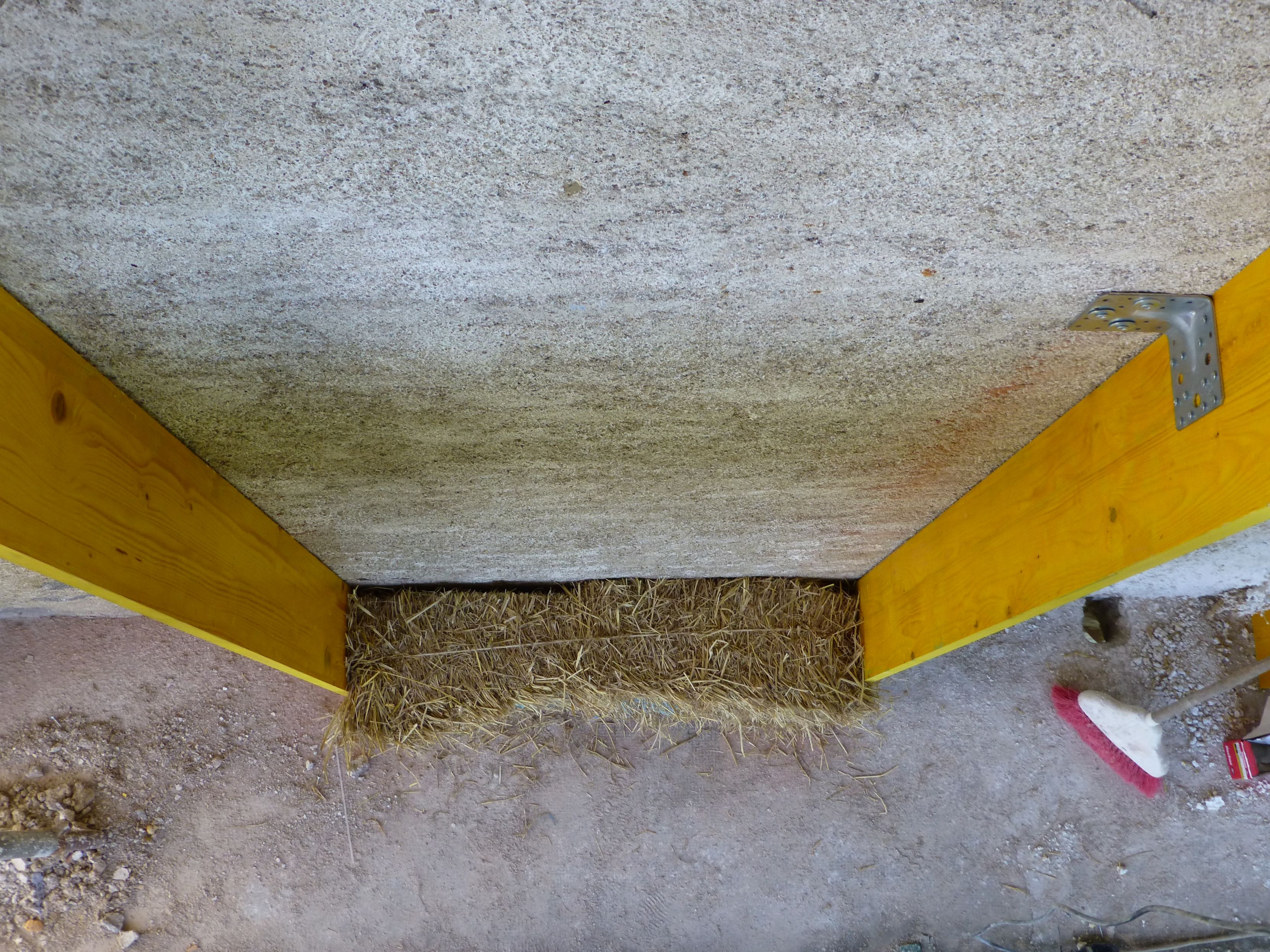 La parte inferiore dei telai a contatto con il terreno è stata trattata in modo da proteggere la paglia dall’umidità di risalita e da pioggia battente diretta o di rimbalzo sul terreno mantenendo la paglia a una quota più elevata.