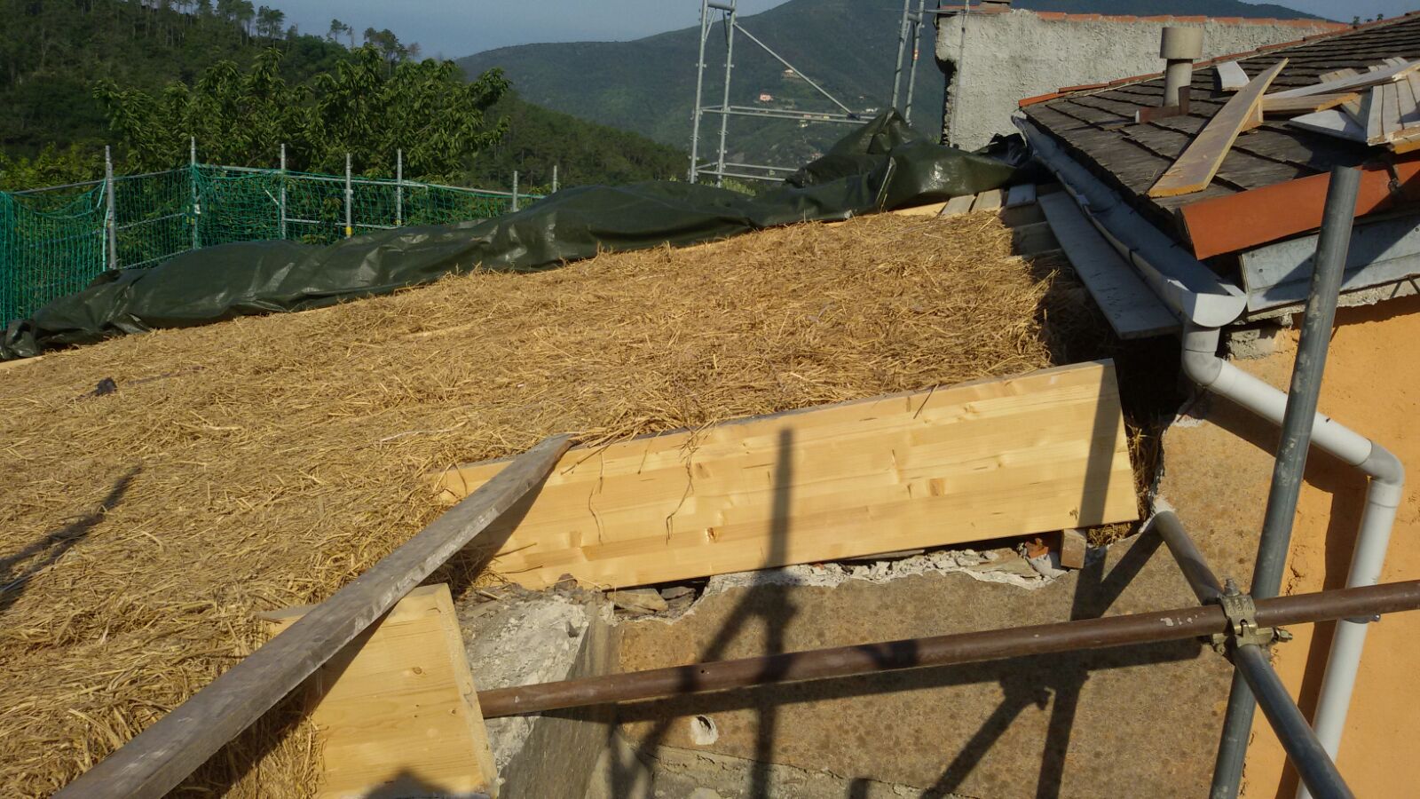 La struttura del tetto, costituito da un’unica falda inclinata, è stata completamente demolita e ricostruita con travature principali e tavolato, sul quale è stato poi realizzato uno strato isolante in balle precompresse di paglia di riso. La stessa tecnologia è stata utilizzata anche per la realizzazione dell’isolamento a cappotto verticale dell’edificio.