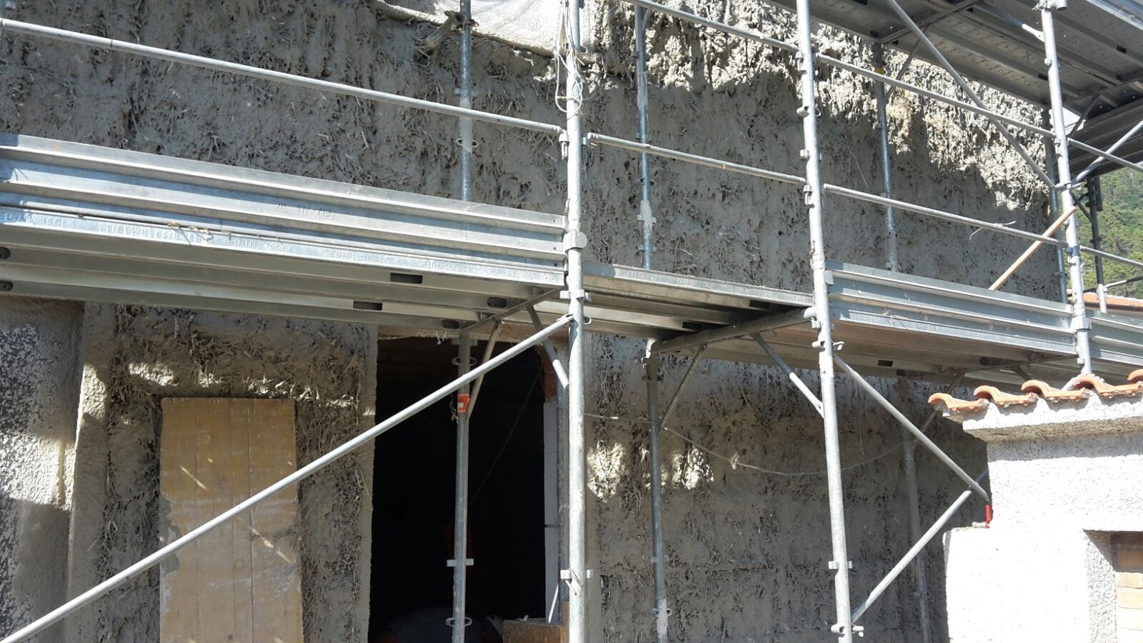 Il cappotto è stato realizzato mediante posa in opera di assi da cantiere con funzione di scansione e supporto, e tamponamento in balle di paglia di riso divise a metà, per uno spessore di 22,5 cm.