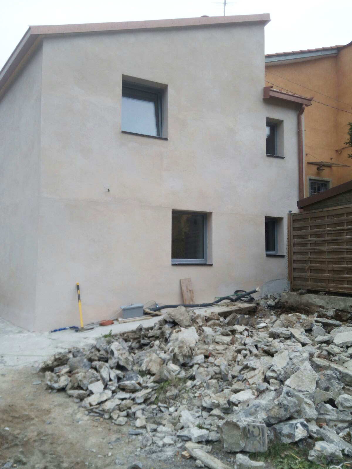 La parte frontale è stata poi rivestita con una rete porta intonaco avente maglia 40×40 mm per la successiva fase di intonacatura. Sulle pareti rivolte verso l’edificio adiacente, ove non era possibile l’applicazione di un isolamento a cappotto a causa dello spessore dello stesso, è stato invece utilizzato un termointonaco dello spessore di 5 cm. L’intonaco a calce naturale è stato applicato a pompa.