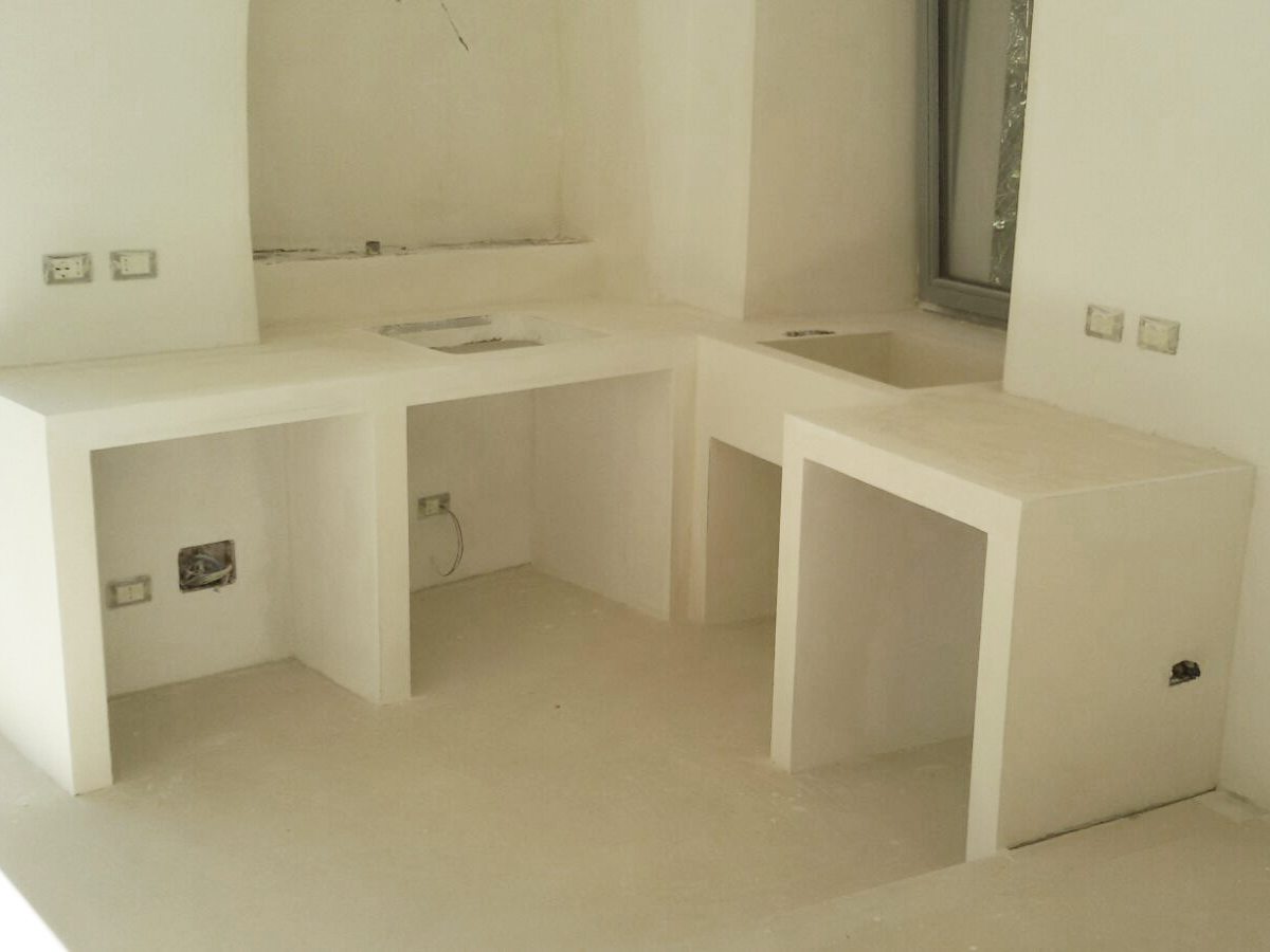 Sulle superfici della cucina e dei bagni sono stati utilizzati intonaci in argilla impermeabilizzata mediante l’aggiunta di resine e cere naturali, consentendo un’ottimale gestione dell’umidità in eccesso, escludendo tuttavia il rischio di dilavamento del materiale a contatto con l’acqua.