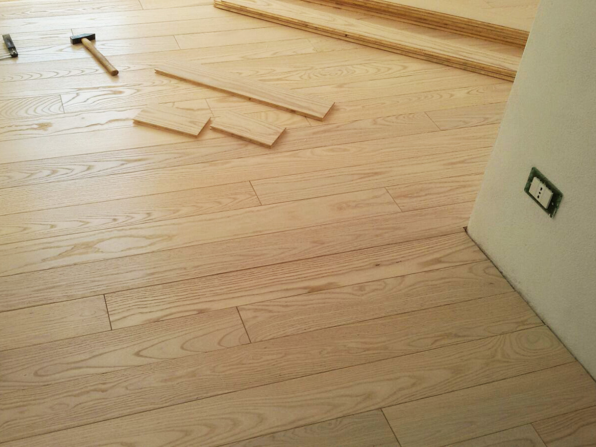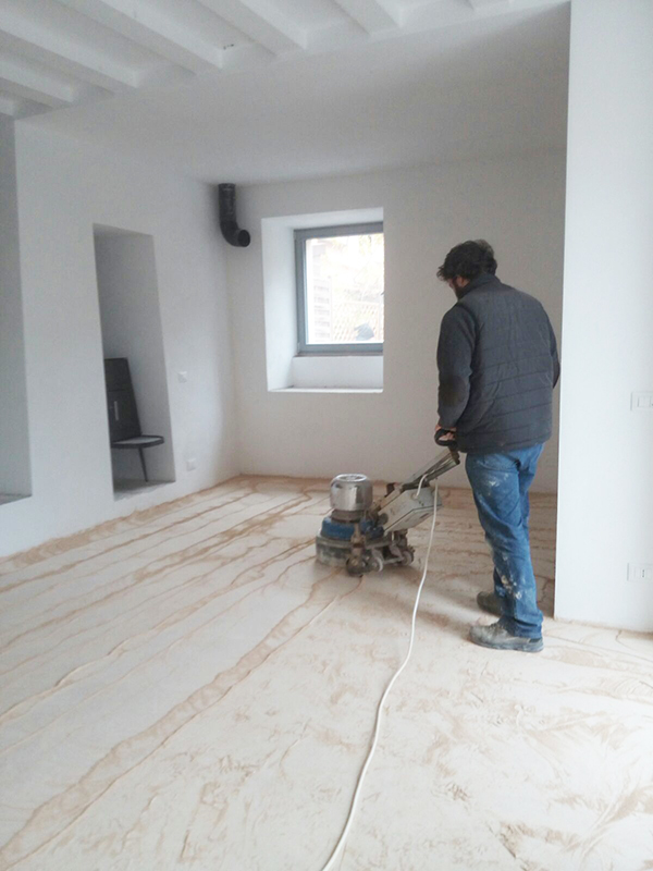 Per l’isolamento del solaio controterra è stata utilizzata della ghiaia di vetro cellulare espanso per uno spessore di circa 10 cm su cui è stato poi gettato un massetto ripartitore da 5 cm. La pavimentazione è stata poi realizzata in cocciopesto, un composto di frammenti di laterizi (tegole o mattoni) minutamente frantumati e malta fine a base di calce aerea, successivamente levigato e oliato per renderlo impermeabile.