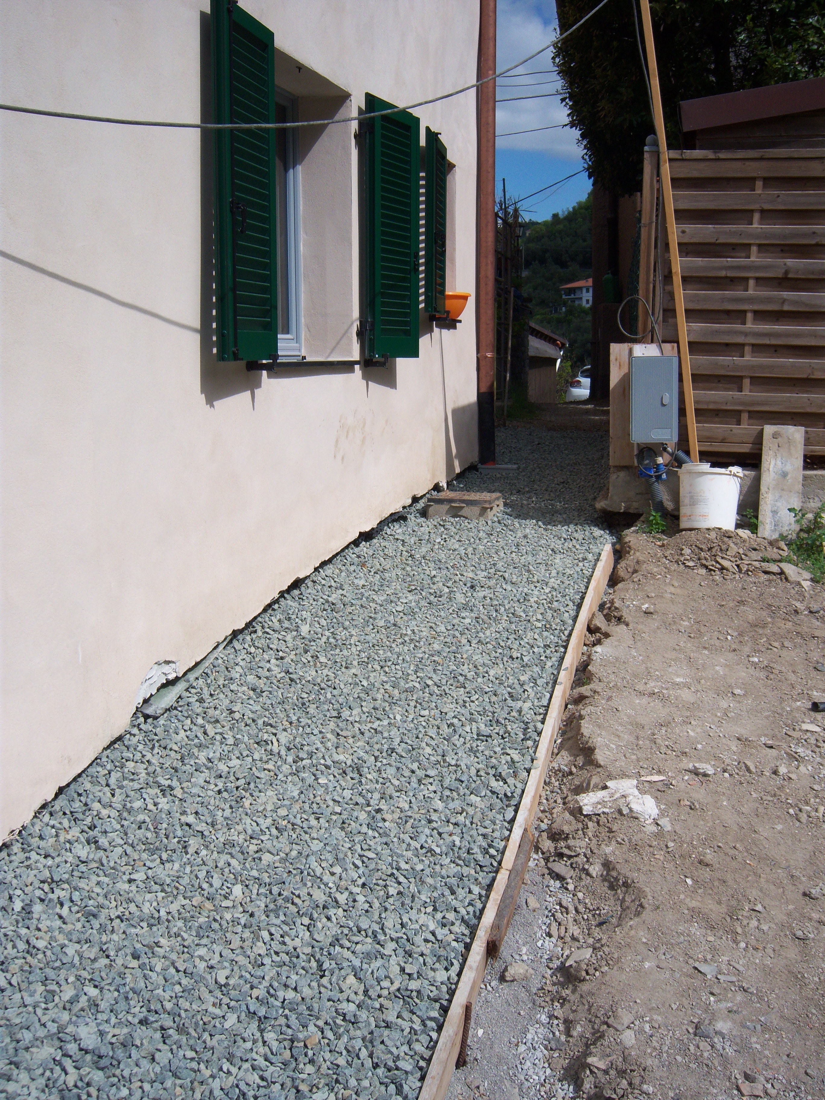 Anche nei piccoli dettagli è stata posta dunque una grande cura, per far sì che tutto fosse parte di un insieme curato e armonico. Tutto intorno all’edificio è stato rimosso il marciapiede esistente in cemento armato e, dopo aver scavato per alcuni centimetri, è stata posata della ghiaia con la duplice funzione di evitare l’acqua meteorica di rimbalzo e di drenare le precipitazioni per mantenere asciutte le superfici.