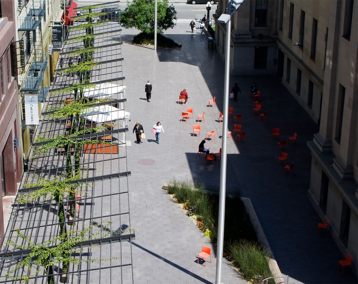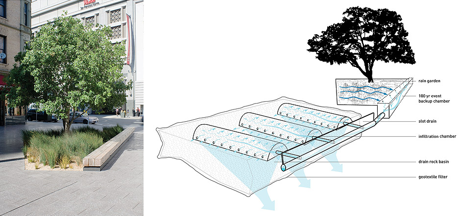 Mint plaza, San Francisco, Usa. Nati in uno spazio urbano riqualificato nel cuore della città, i rain garden di Mint plaza diventano un’occasione per sperimentare nuove tecnologie e pensarne un possibile sviluppo a scala urbana. Il progetto di Cmg Landscape Architecture cerca di dare una risposta al problema dell’eccesivo accumulo di acqua in un’area fortemente urbanizzata, nella quale l’ormai obsoleta rete fognaria risulta insufficiente.