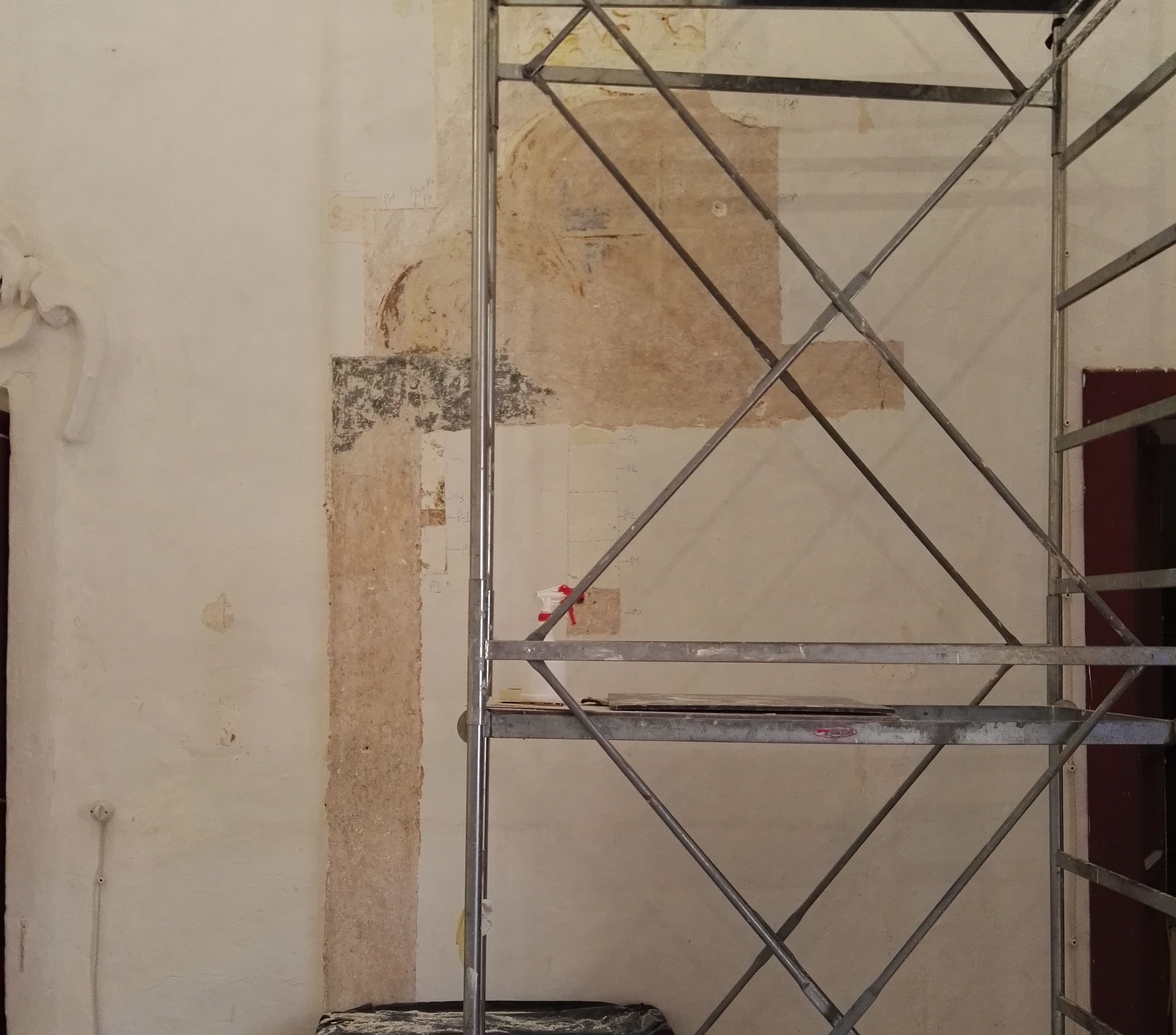 Nel corso dei lavori di efficientamento energetico, i saggi avevano messo in luce tracce di decorazioni sulle mura in pessimo stato di conservazione, le stanze erano integralmente scialbate con numerosi strati di pittura a calce fortemente adesi alle superfici policrome.