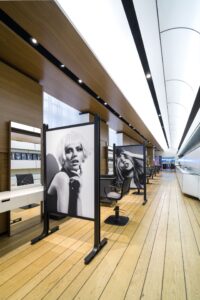 Leggero e resistente, con base di appoggio con supporti antigraffio, il divisorio è stato infatti personalizzato nel suo design con la stampa di ritratti di modelle e modelli in bianco e nero che riproducono trend e novità delle proposte hairstyle di Blend Milano e riprendono lo stile dei quadri già presenti nel locale.