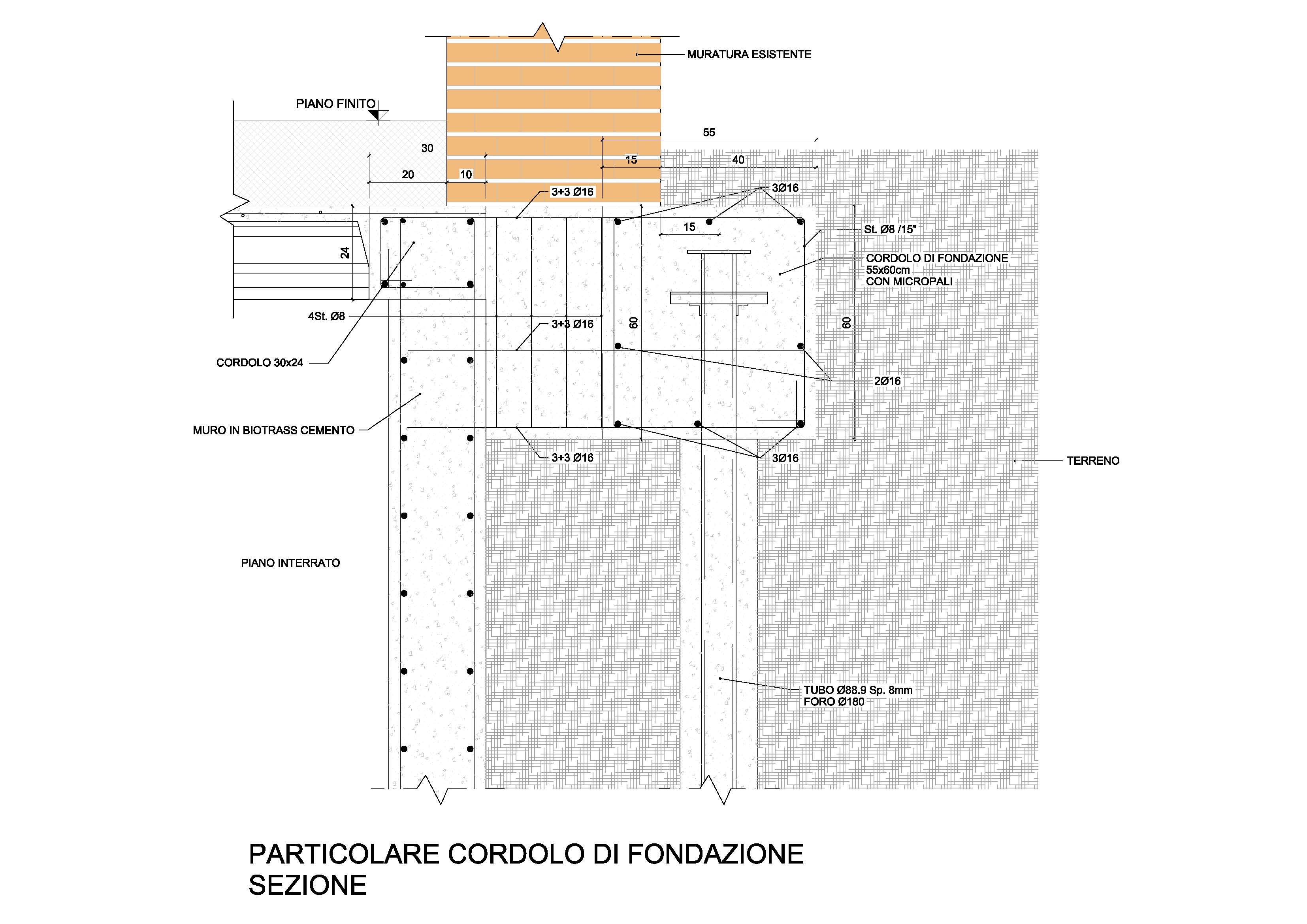 Fondazioni e sottofondazioni. Sono stati realizzati setti di sottofondazione collegati tra loro con platea armata in cemento armato e micropali. Le opere di sottofondazione e di nuova fondazione sono ammorsate nella formazione geologica integra. Setti sono stati realizzati anche all’interno di tutte le maglie murarie del fabbricato.