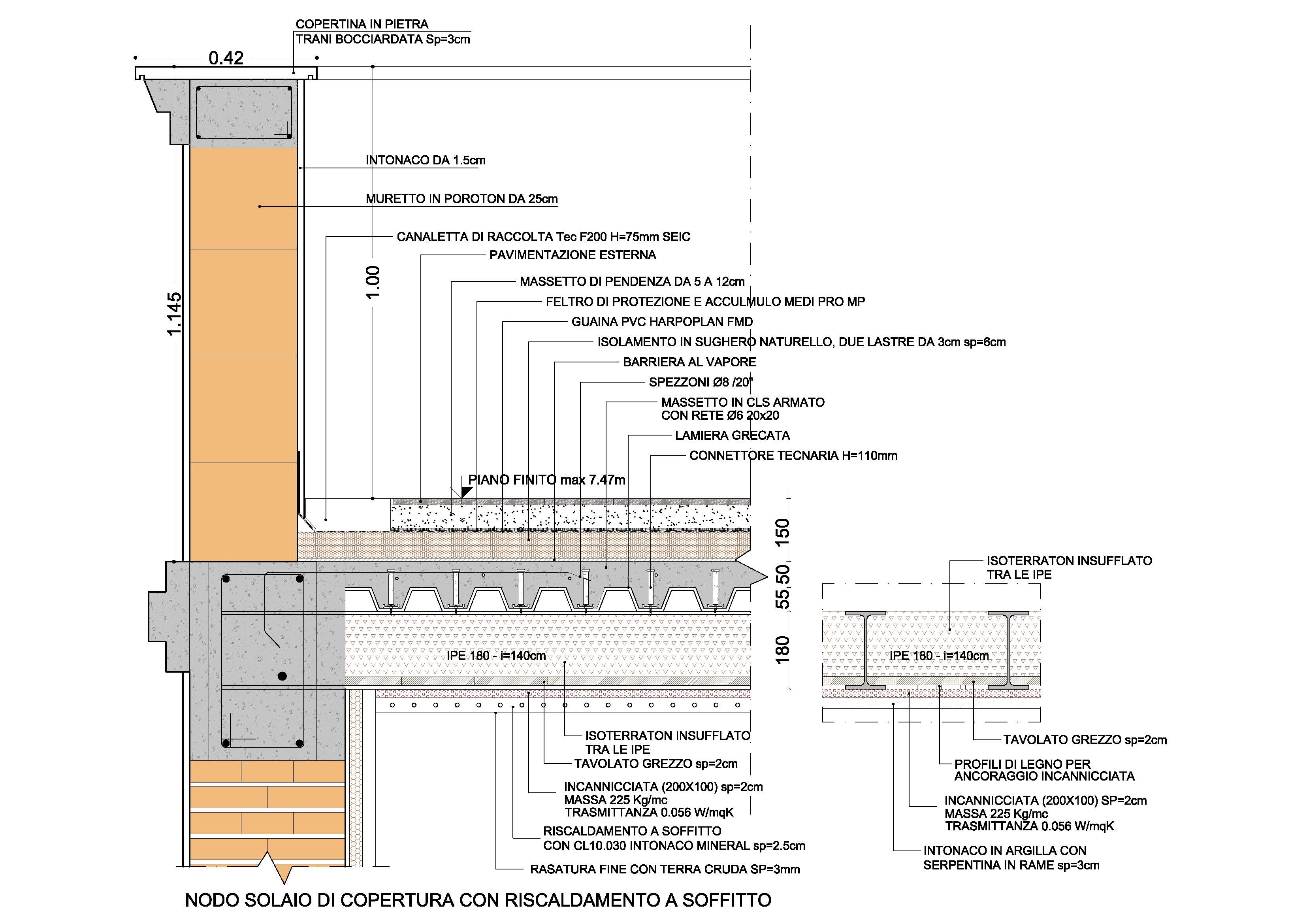 Pareti perimetrali. Le pareti esistenti mattoni facciavista, pulite da intonaci fatiscenti, sono state rivestite da incannicciata costituita da canna palustre naturale legata con filo di ferro zincato. L’intonaco in terra cruda applicato sopra le pareti con incannicciato e riscaldamento in rame a parete è stato applicato con l’uso di malta non troppo solida senza inumidire l’incannicciato.