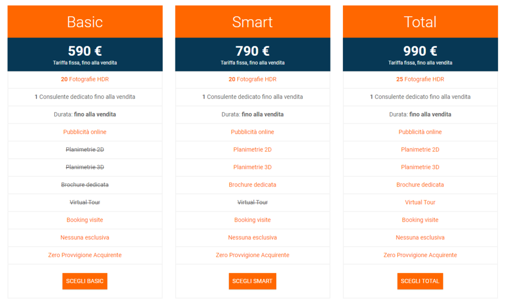 Alla tariffa di 990 euro si affiancano altri due servizi a tariffa fissa:il primo a 590 euro con un servizio base per vendere la propria casa, il secondo a 790 euro per un servizio che comprende anche le planimetrie 3d dell’immobile e brochure dedicate.