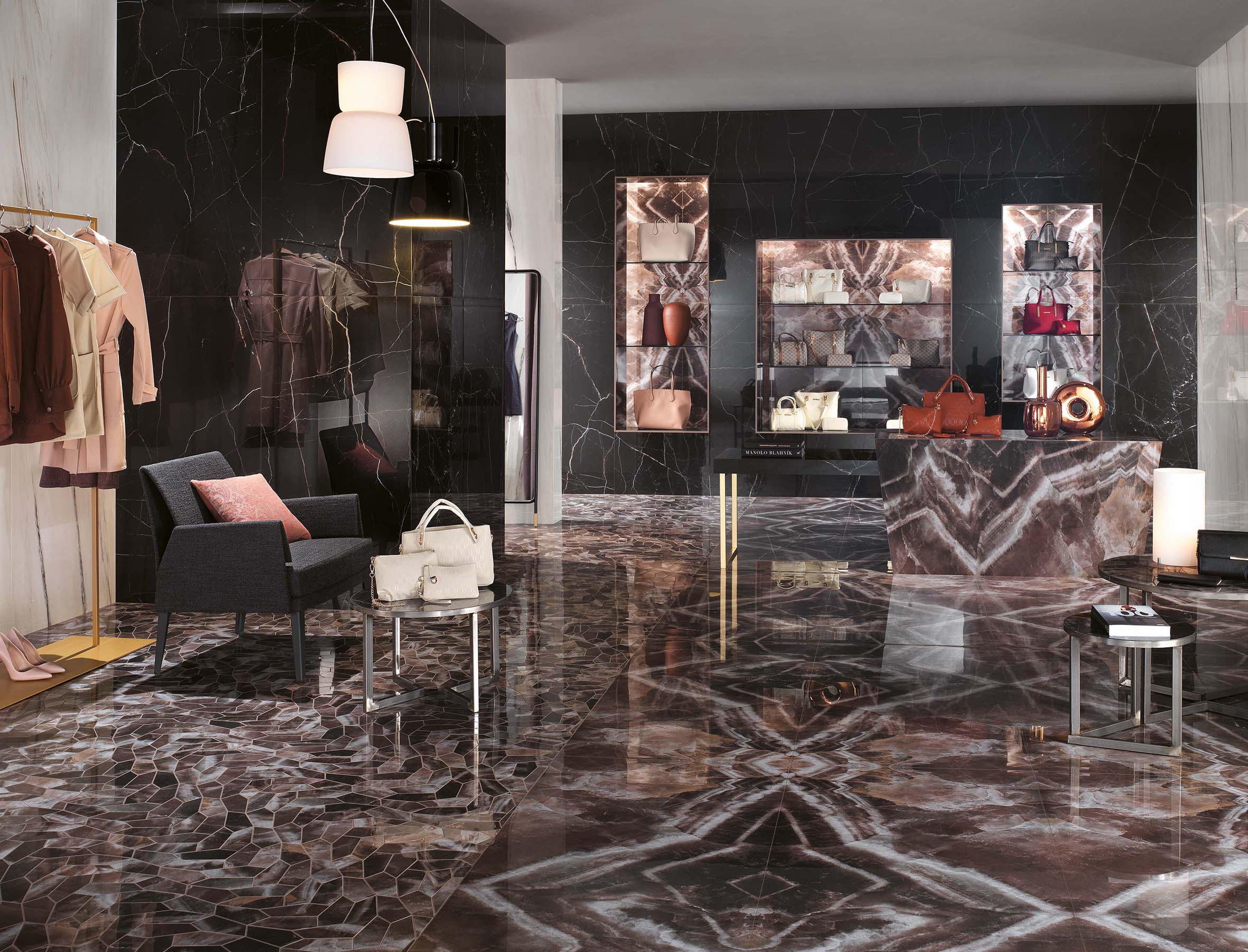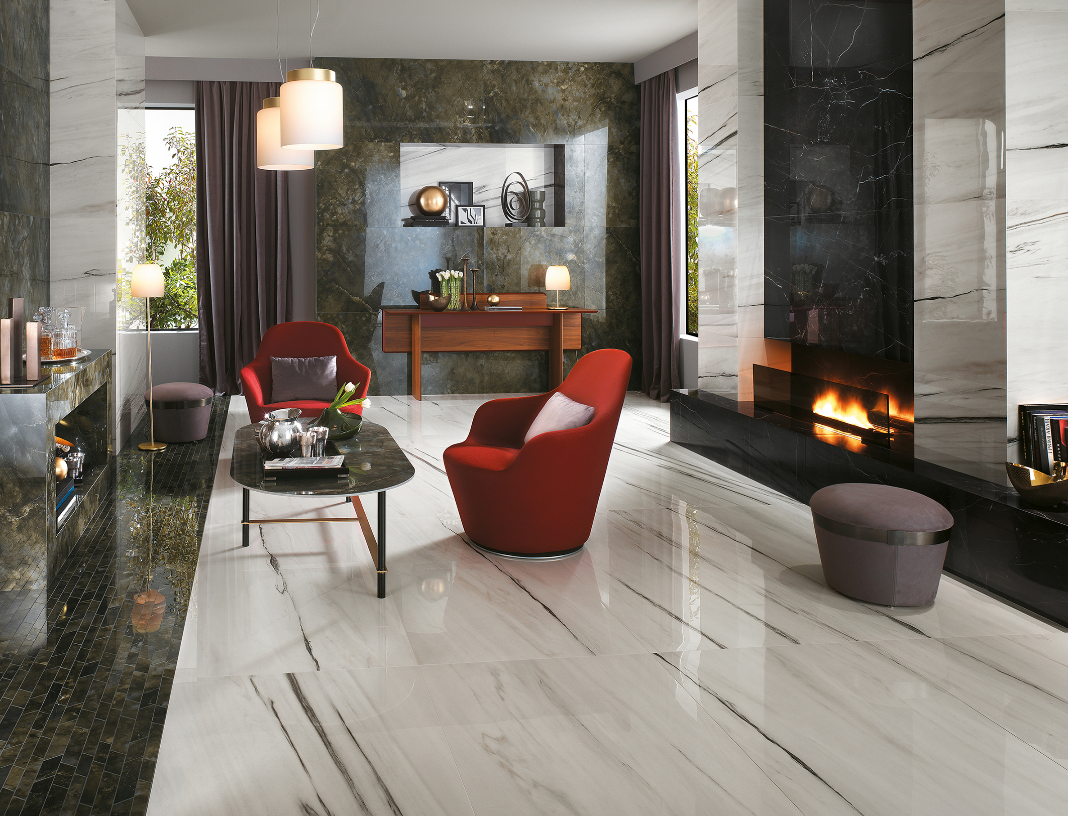 La possibilità di progettare con lastre di grande formato in gres porcellanato (120×278 cm), che esprimono tutte le caratteristiche estetiche di marmi di pregio, e con uno spessore molto sottile (6 mm) consente di realizzare progetti funzionali, di grande atmosfera e dagli inediti accostamenti cromatici.
